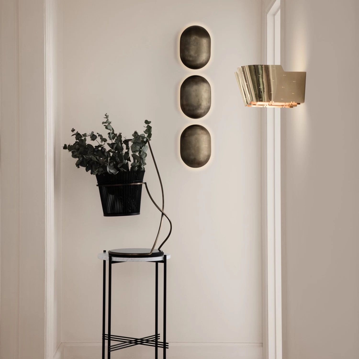 The clean, sculptured brass shade lends an air of elegance with Tynell’s distinctive traits of twin dot perforation pattern combined with notched edges, making the wall lamp appealing and admirable in all its simplicity. Equally relevant today as when first introduced, the 9464 Wall Lamp fits perfectly into contemporary interiors, adding a sculptural effect to the wall whilst simultaneously creating a relaxed yet very refined indirect lighting.