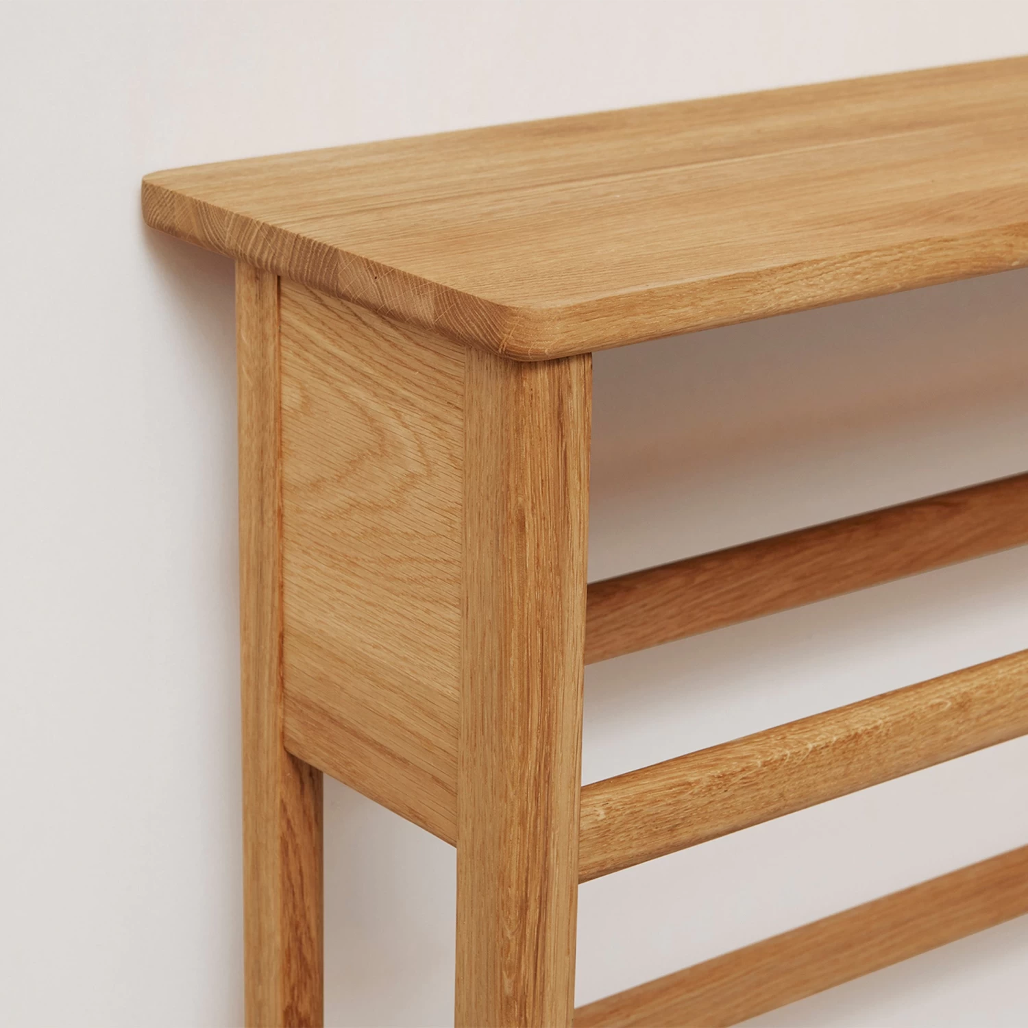 The Shoe Rack 35 is a smart and harmonious combination of shoe rack and console table that helps make the best use of the narrow space found in hallways or utility rooms. It is made of sustainable sourced oak of the highest quality and its contours are rounded carefully in line with artisan craft tradition.