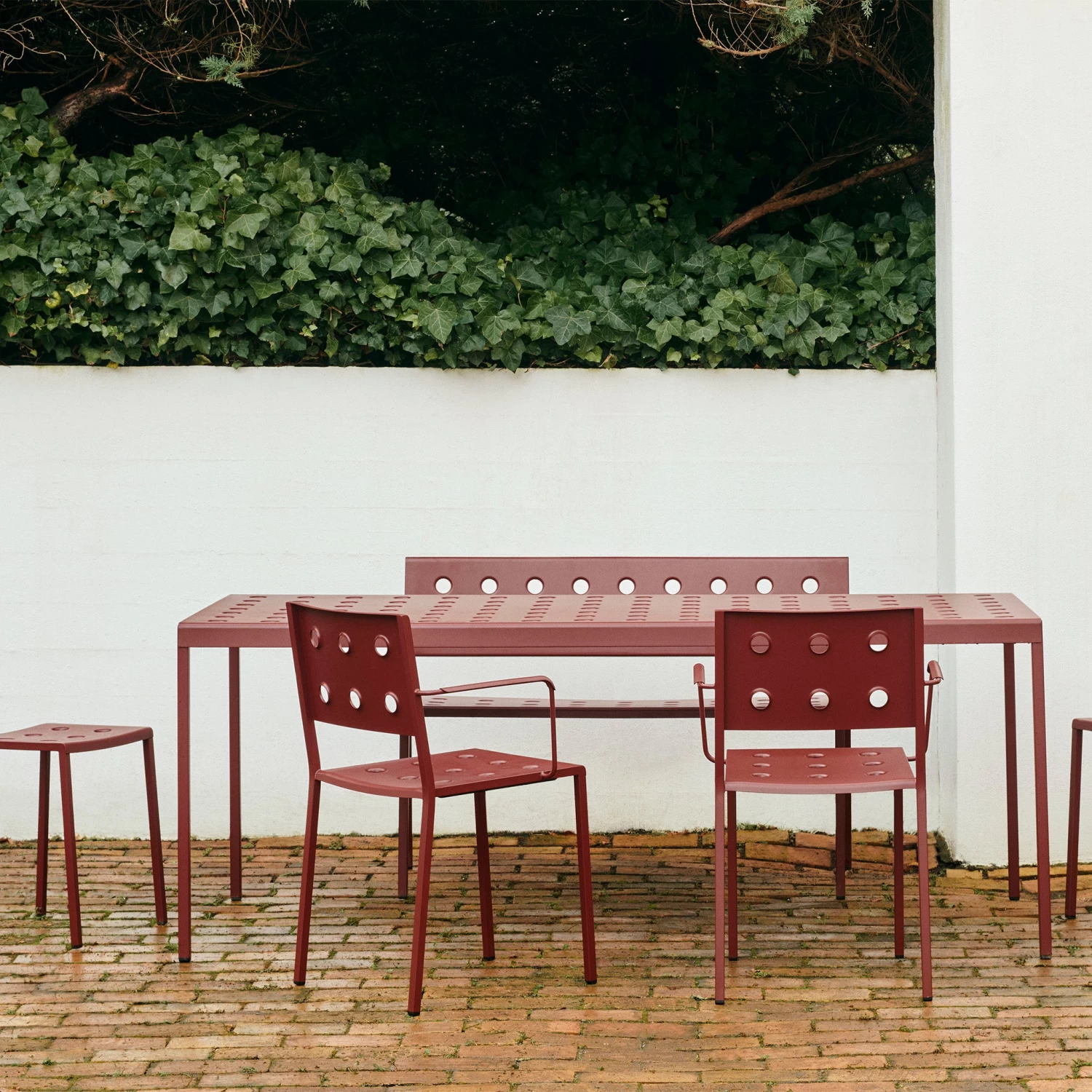 Comprising an assortment of chairs, tables and benches, the Balcony family’s expression is characterised by the symmetrical holes incorporated into the design. The presence of these laser-welded holes softens the aesthetics, as well as providing extra stability.
