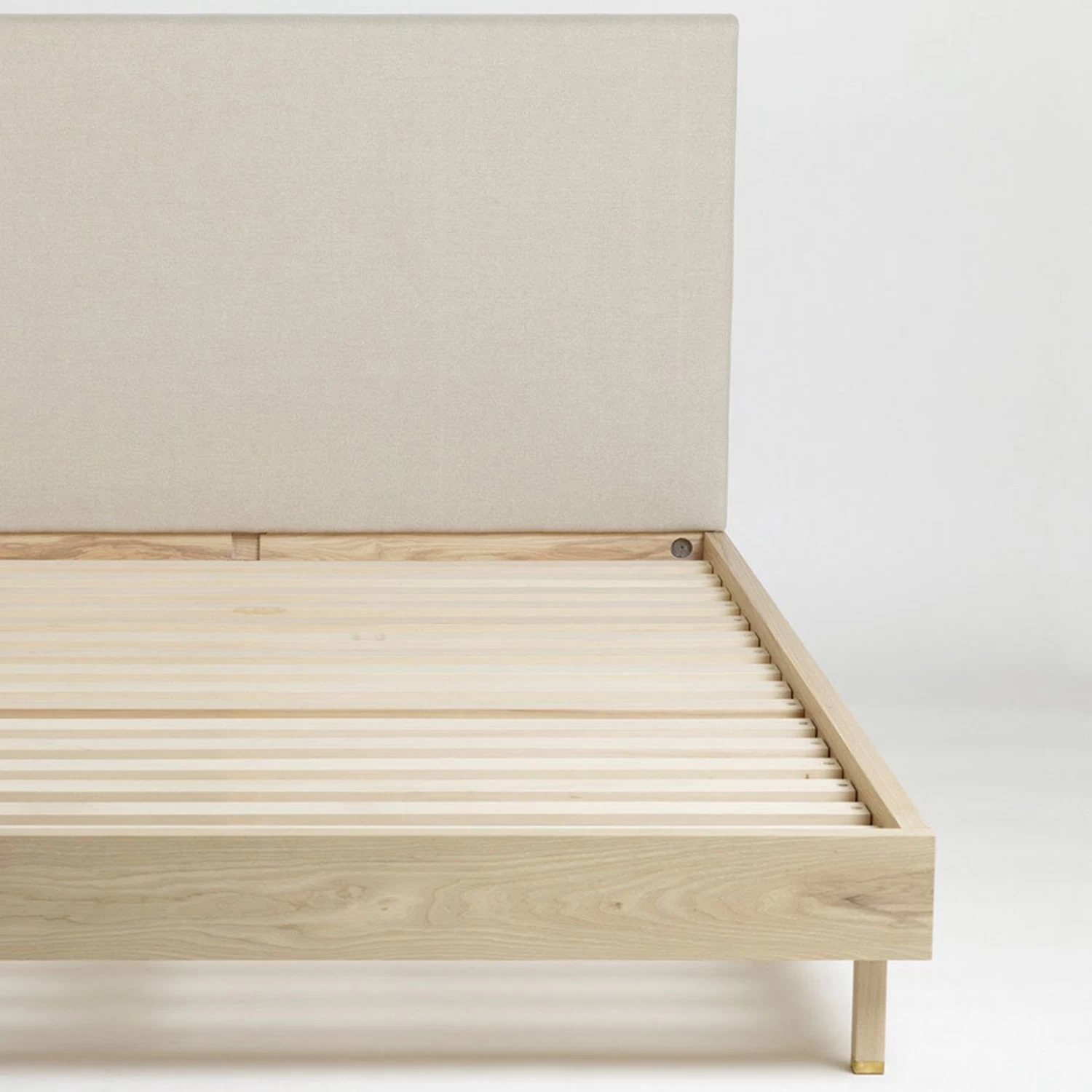 This solid framed bed with a naturally upholstered linen headboard is inspired by the functional forms, clean lines, and enduring craftsmanship of Shaker furniture.