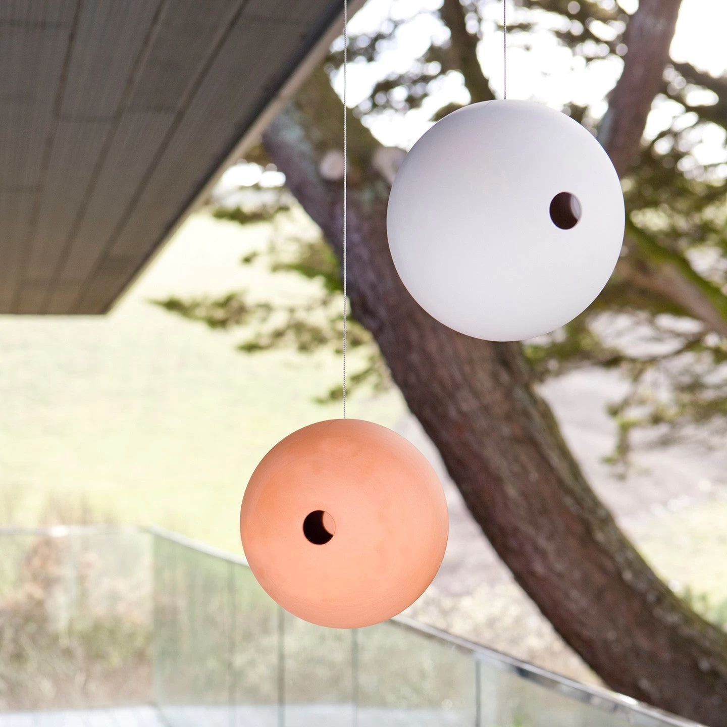Available in matt white ceramic or terracotta with stainless steel cable.
