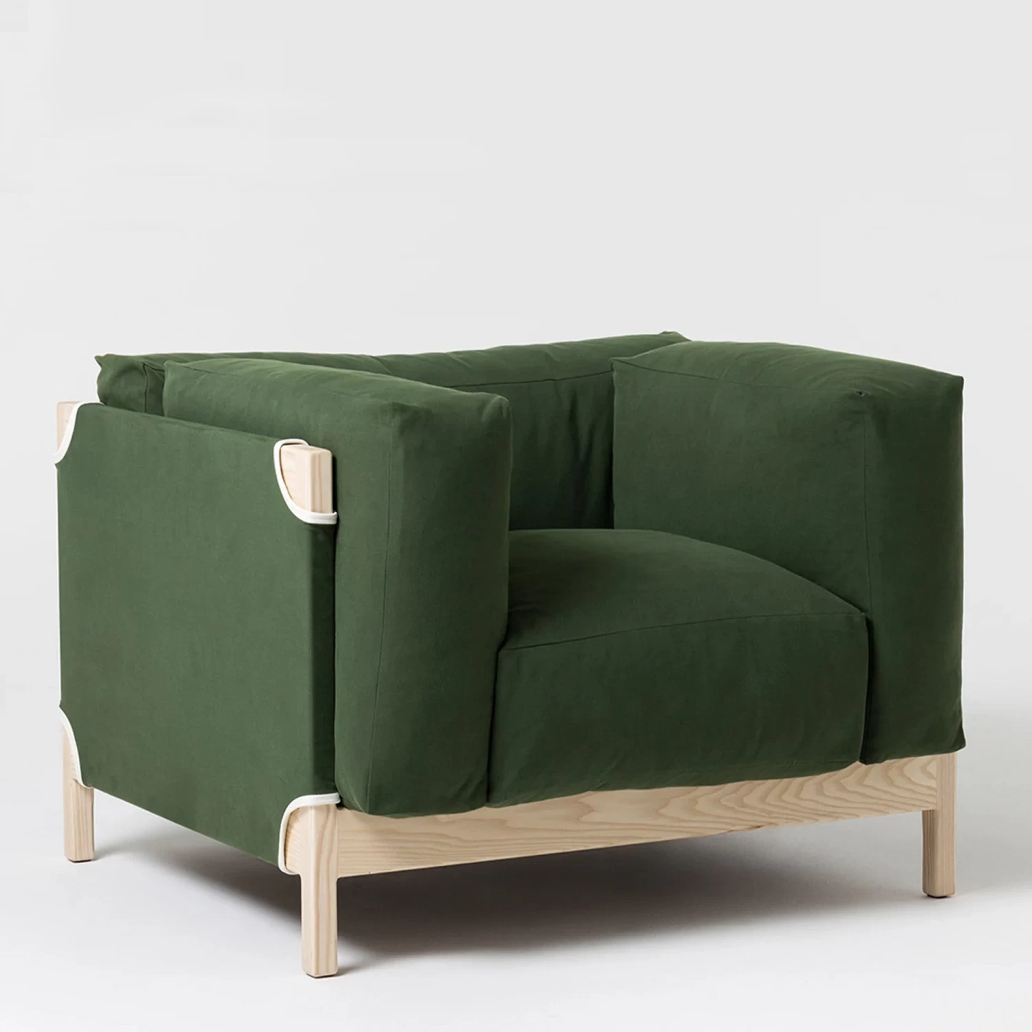 With stylistic references to military 1940s and 50s camp gear, the armchair is a simple wooden frame, with a webbed seat pad and four feather cushions. It utilises hard-wearing cotton and is finished with leather trimming details.