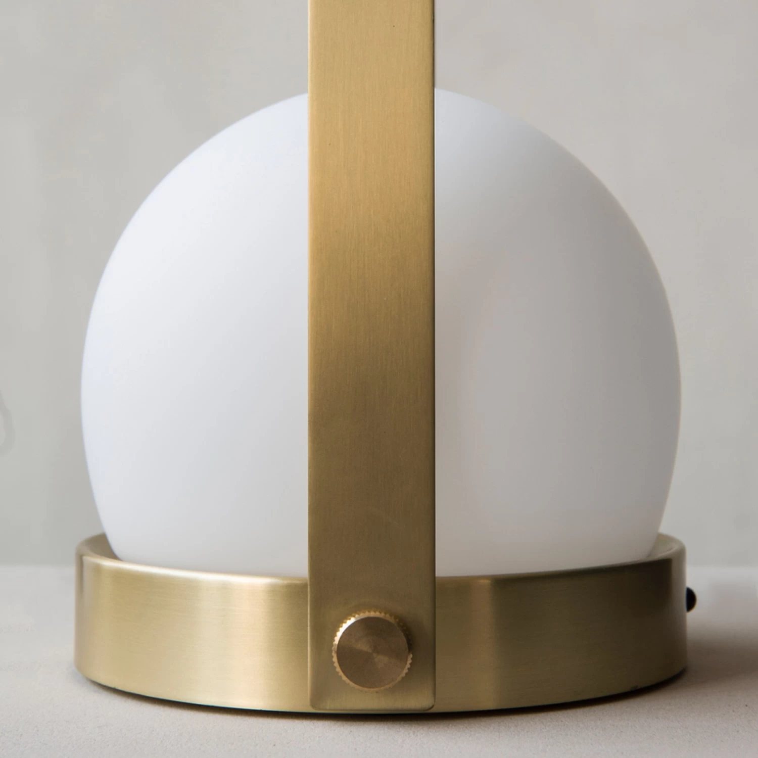 Mouth-blown opal glass shade with an acid finish. The base and handle is made from brushed brass.