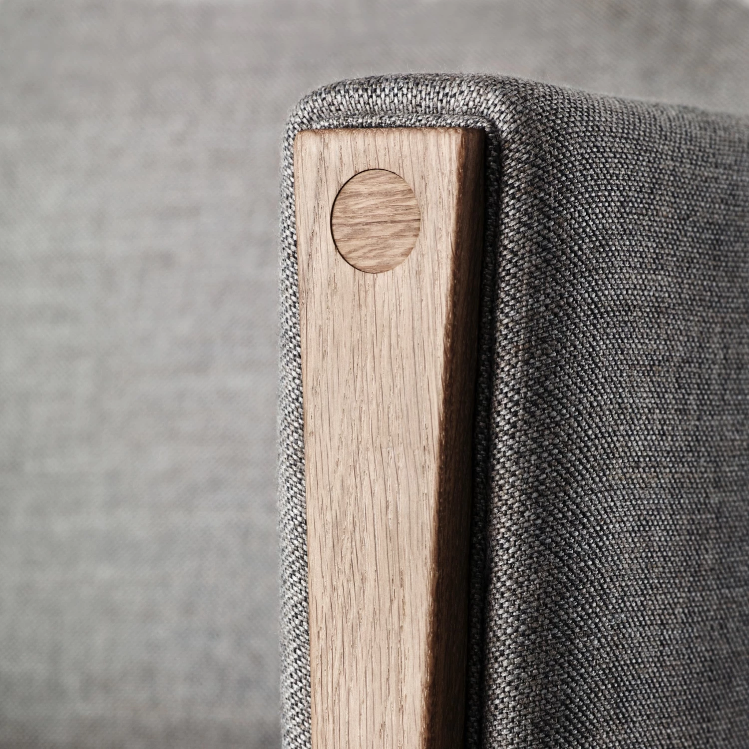 The solid wooden frame of Wegner’s sofa is firmly upholstered. The pillows have down wrapped around the core foam, which allowed Wegner to add softness and excellent comfort to the geometric form.