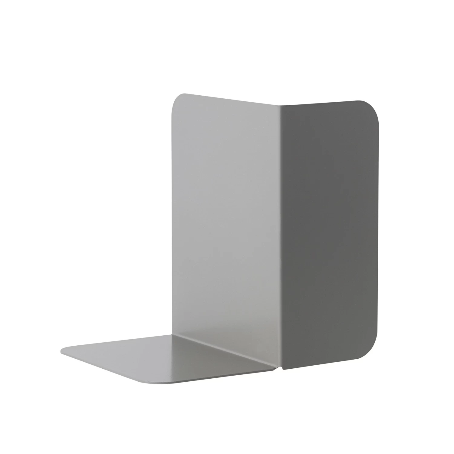 A flexible bookend that can be placed in different ways to support various sized books. The bookends serve as a sculpturally decorative element adding color and personality to a shelving system.Â