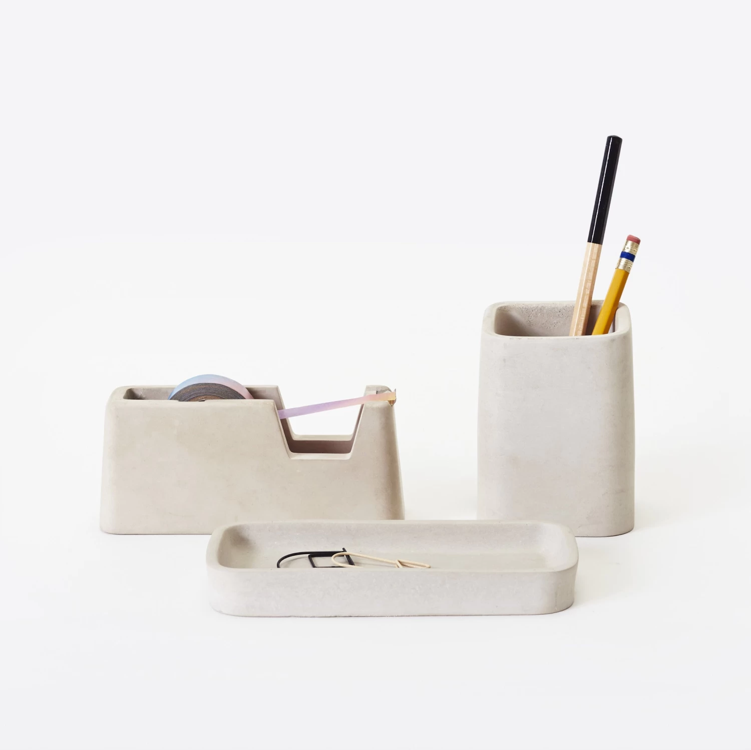 Getting organized is often as simple as having the right tools. With Concrete Desk Set everything has its place. Cast from solid concrete, the set includes a tape dispenser, pencil holder and a small tray.