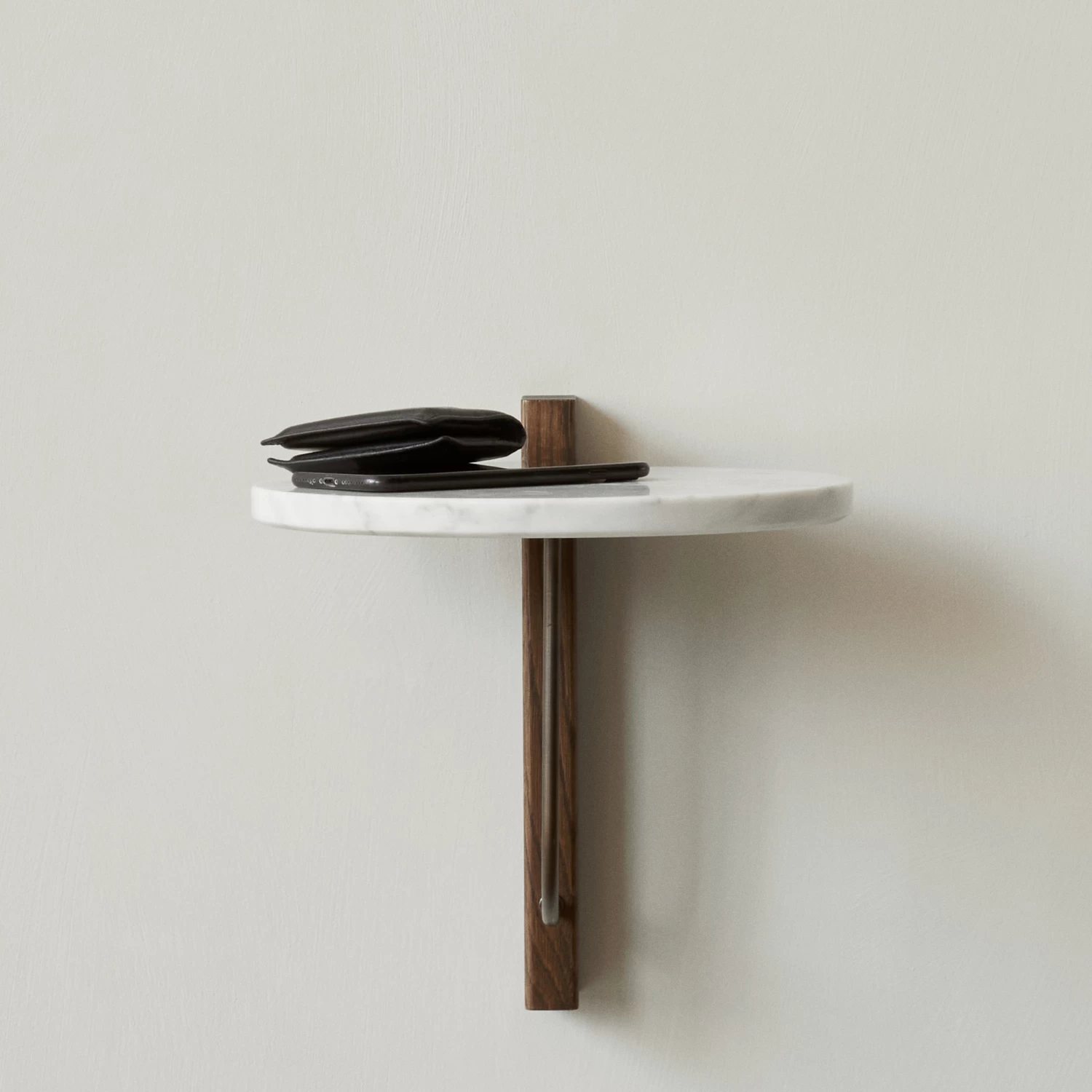 The modernist Corbel Shelf is a wall-hung podium that combines contrasting materials to arresting effect. The invention of design studio Krøyer-Sætter-Lassen, the versatile design in marble, oak and plated steel takes its name and design cues from architectural weight-bearing brackets traditionally made from stone or wood.