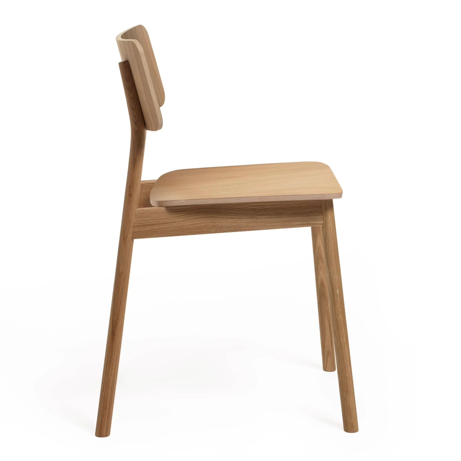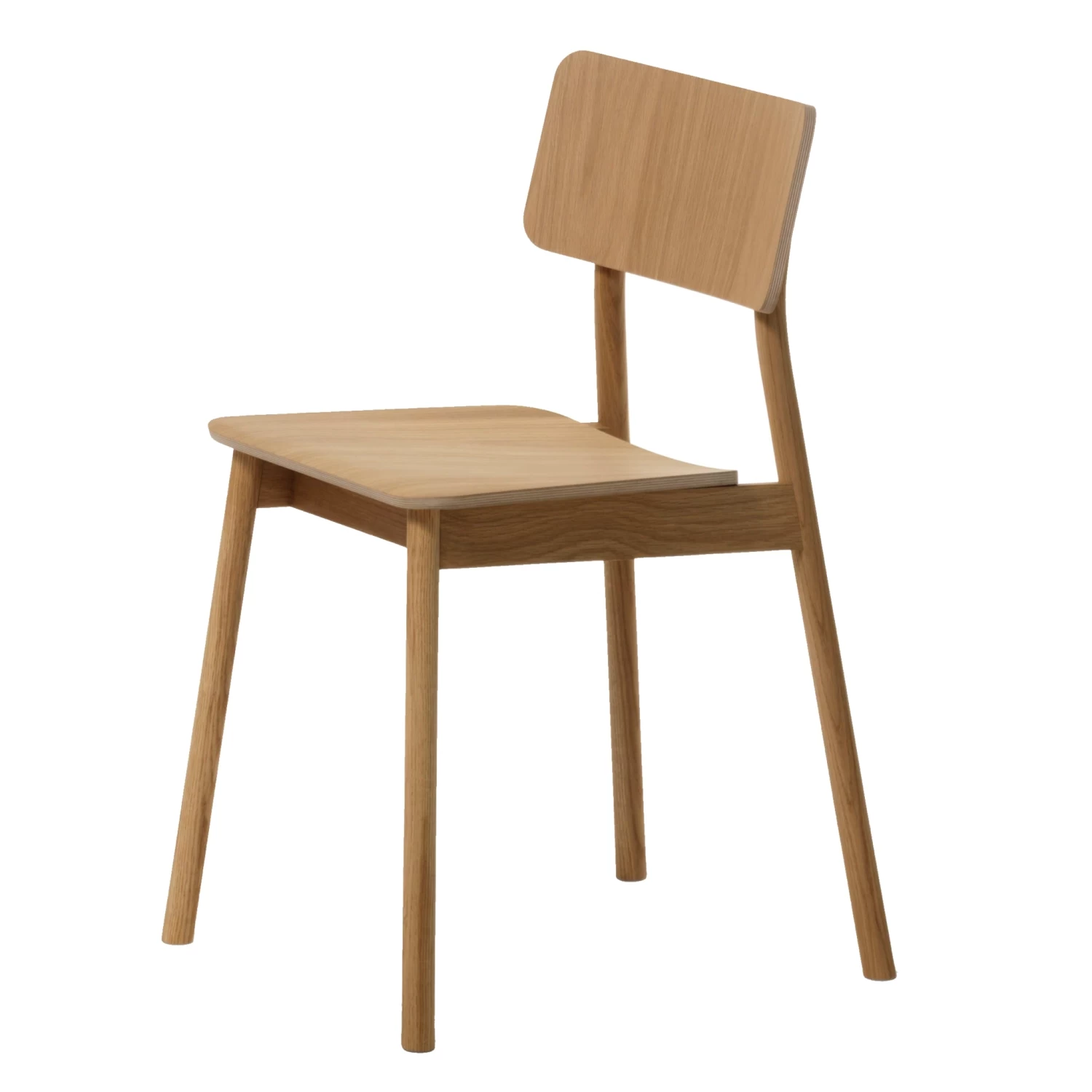 Form pressed oak veneer on seat and backrest. Solid oak in frame and legs.