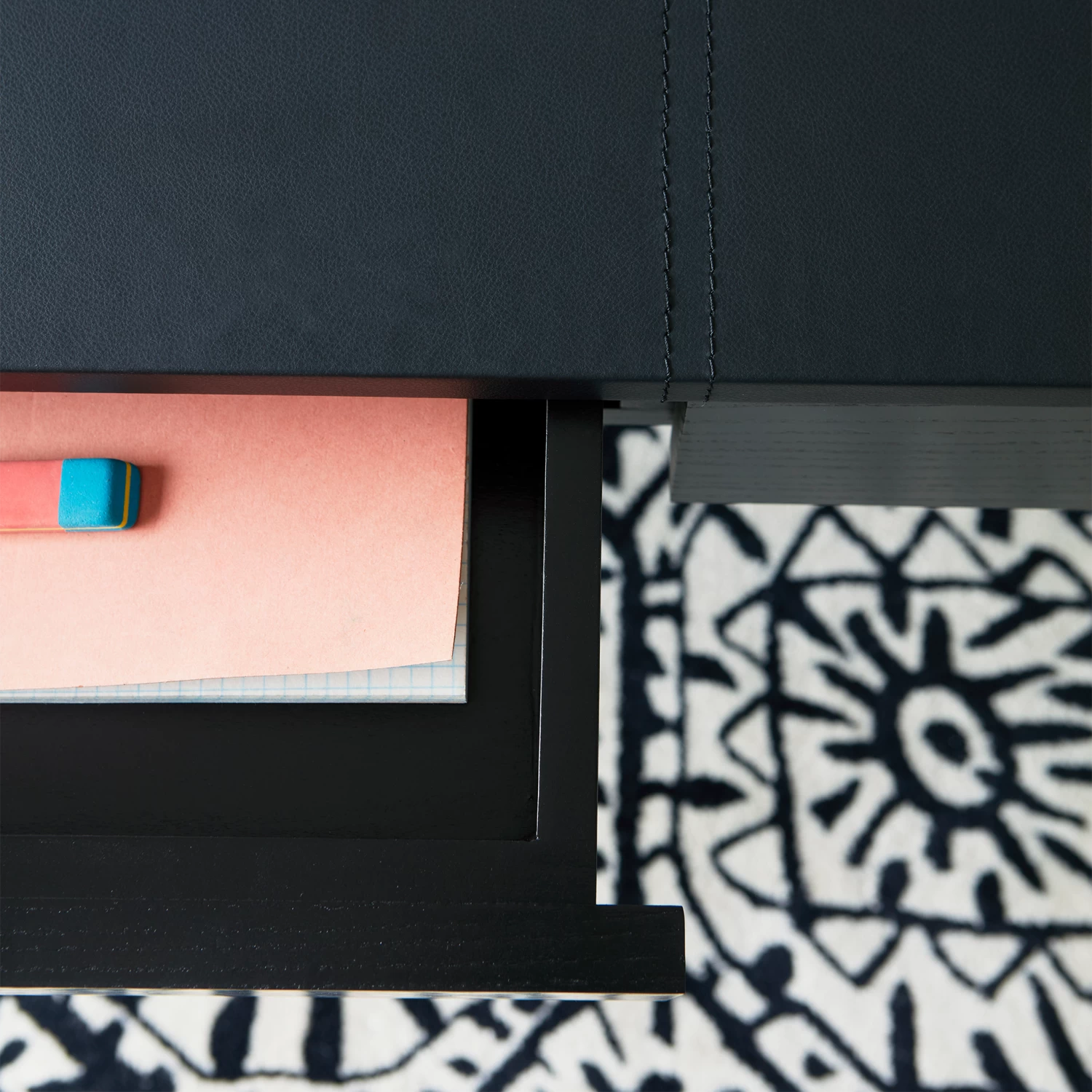 Drape Desk provides visual expression through thoughtful design: the leather-wrapped tabletop is articulated as a “drape” that falls over the table legs, lending a sense of continuity to the silhouette. Two drawers tucked underneath run the length of the table for ample storage. On the back, a flip down door reveals cable management.
