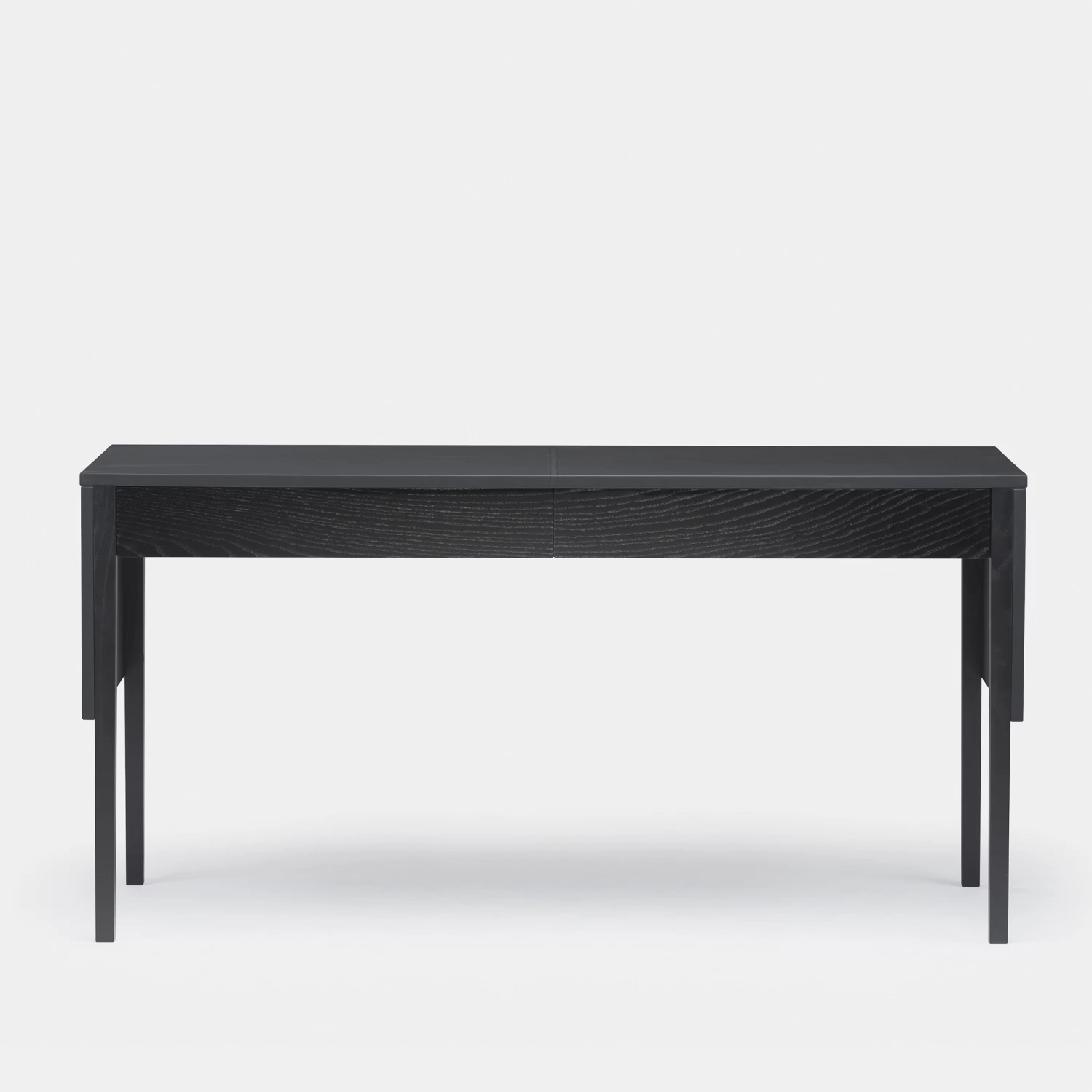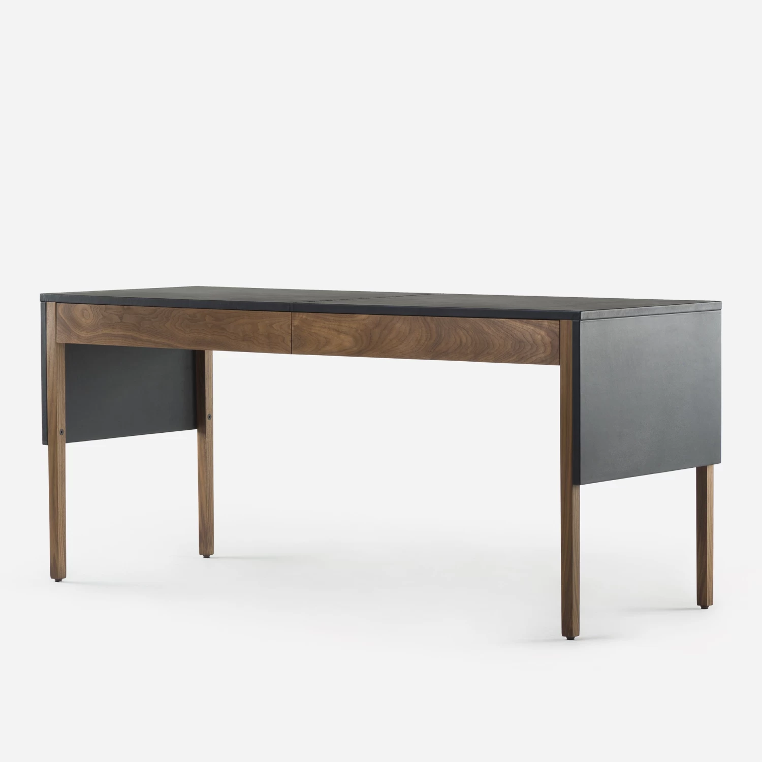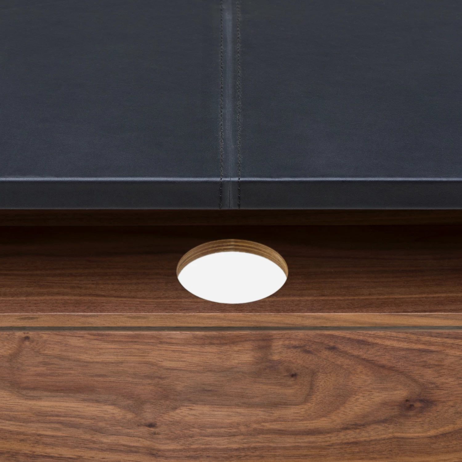 Available in American black walnut, American white oak, or European Ash in a range of finishes, with a tabletop in either black or brown natural grain leather.