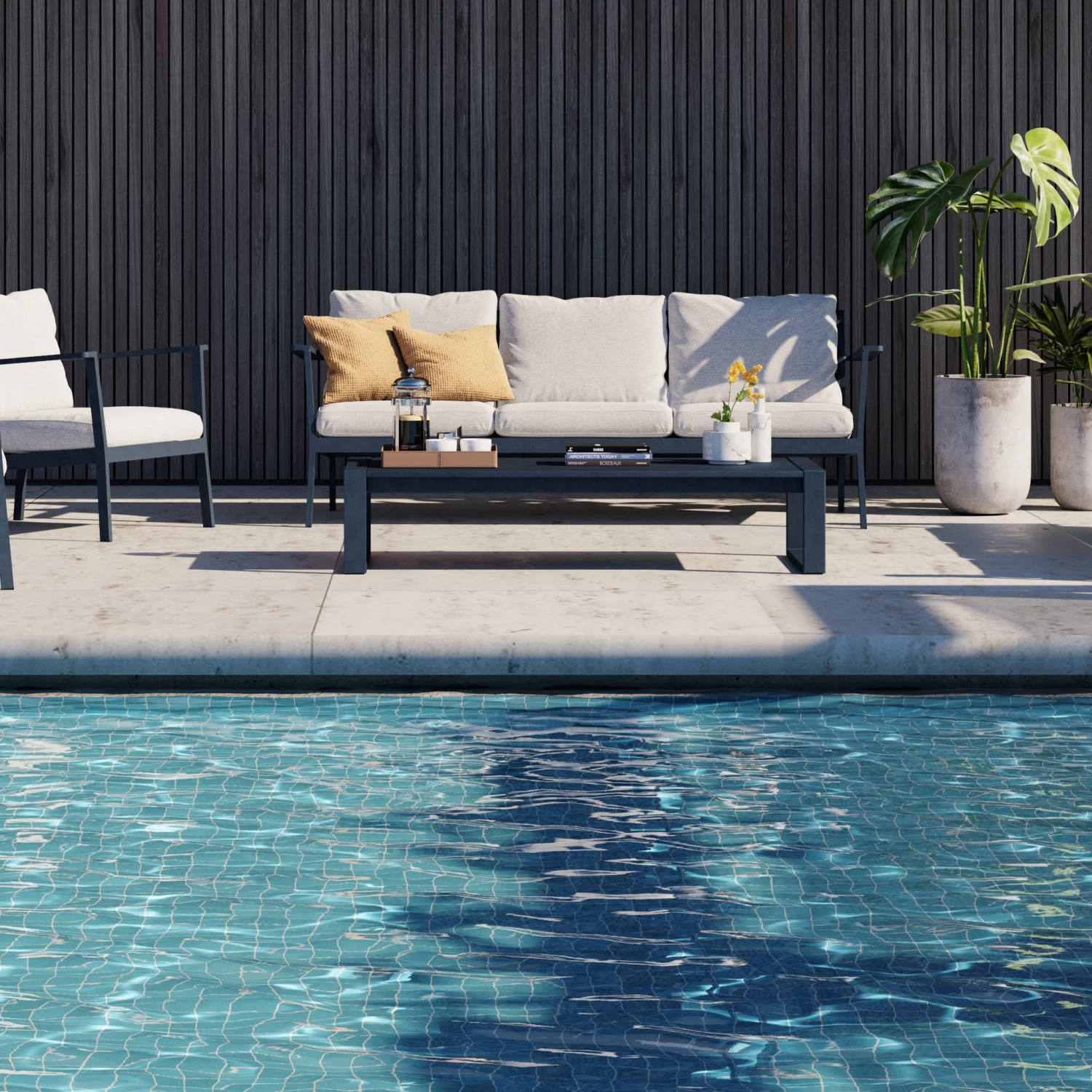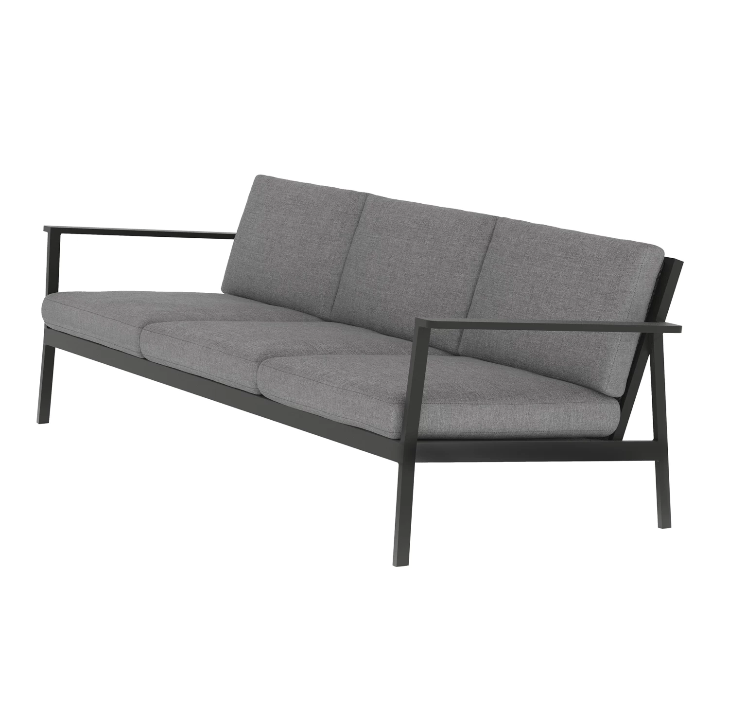 The Eos 3-Seater Sofa is fitted with comfortable seat pads and cushions upholstered in charcoal grey or rust Sunbrella ® fabric, perfect for relaxed alfresco lounging.