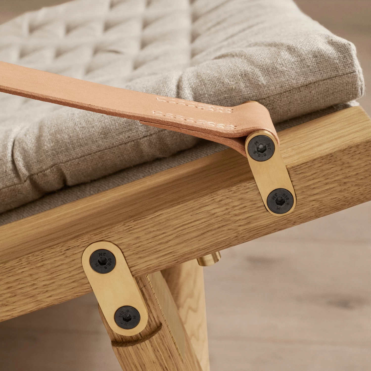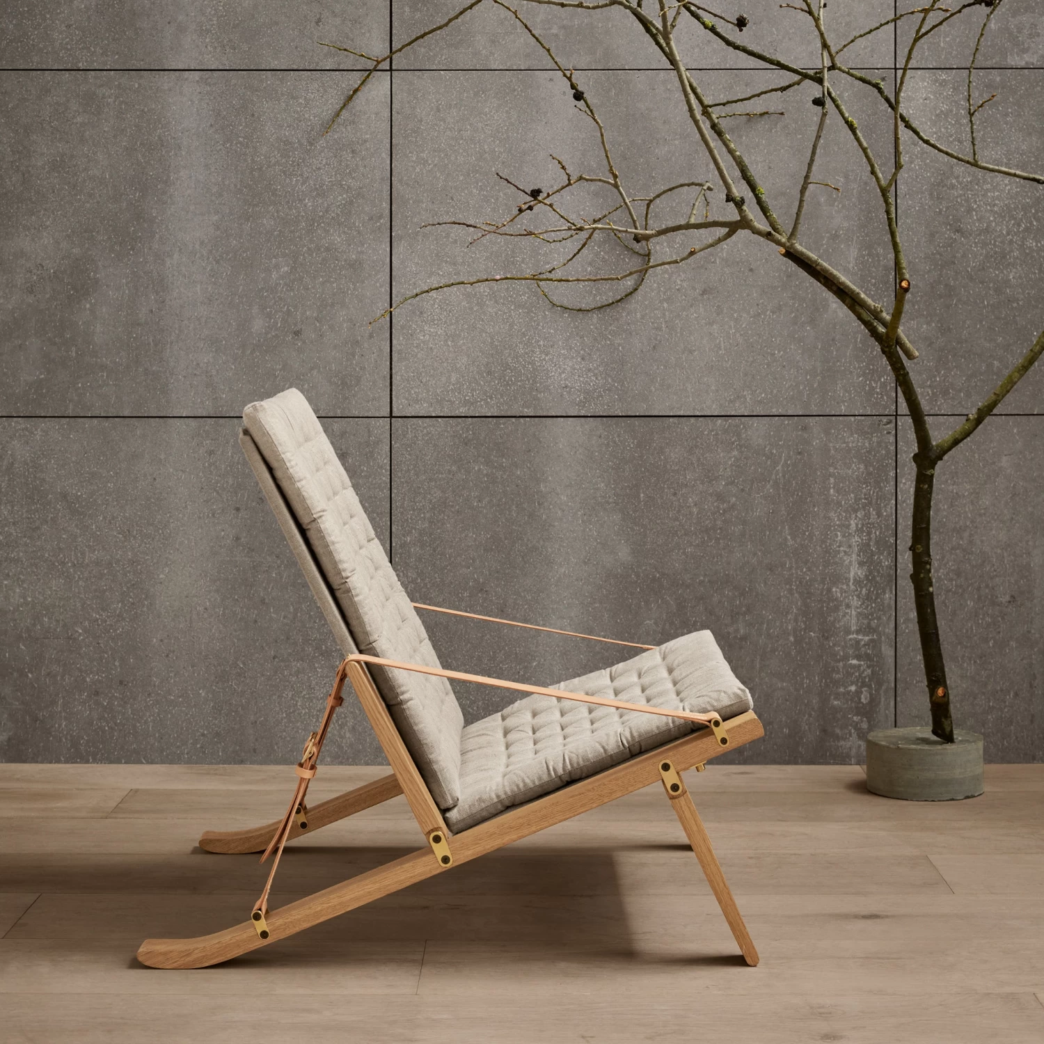 The chair is foldable with loose, reversible cushions. It was first presented in 1964 when it won the Copenhagen Cabinetmakers’ Guild Furniture Prize for its outstanding craftsmanship and expression.
