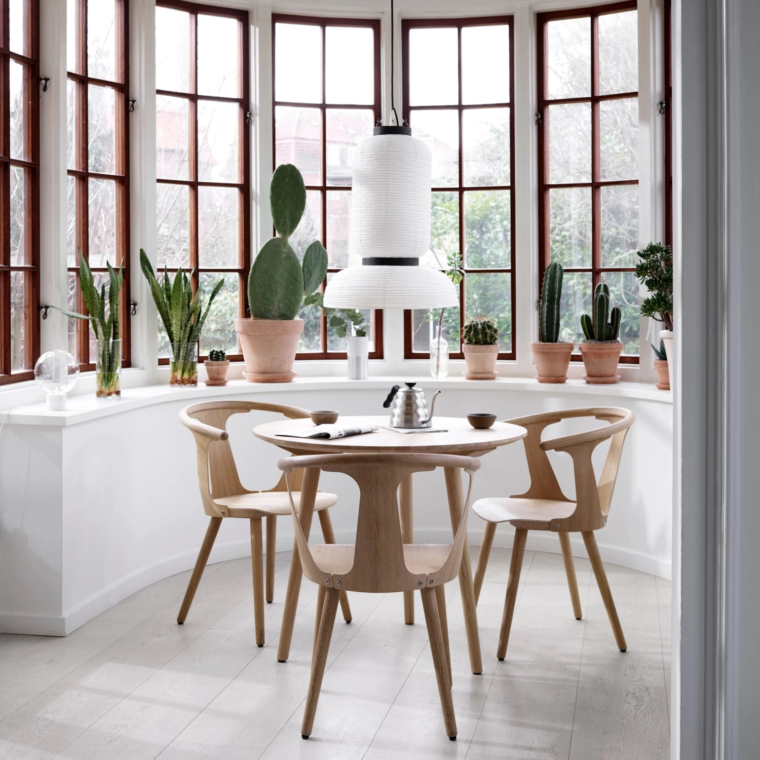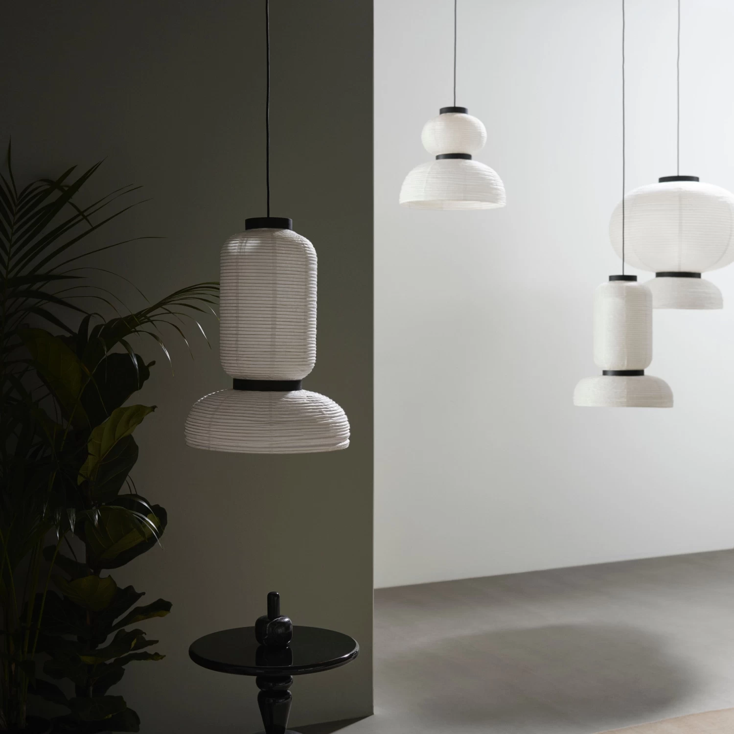 The Paper Lantern series is comprised of three different versions in ivory white rice paper with black stained Oak accents in sizes from 46 cm to 70 cm in diameter. Each weighing only 1 kilo, they hang delicately in any indoor setting.Â