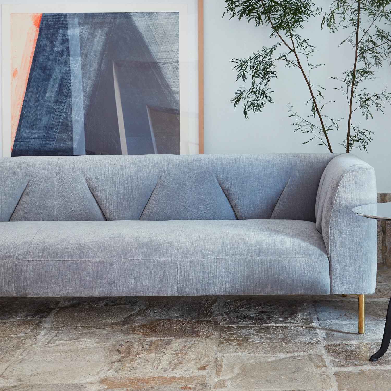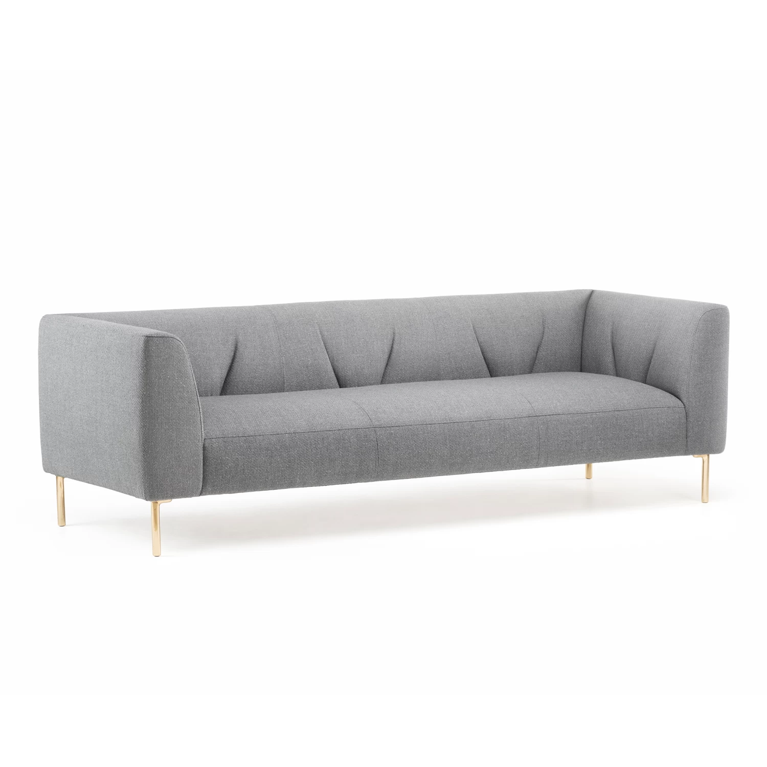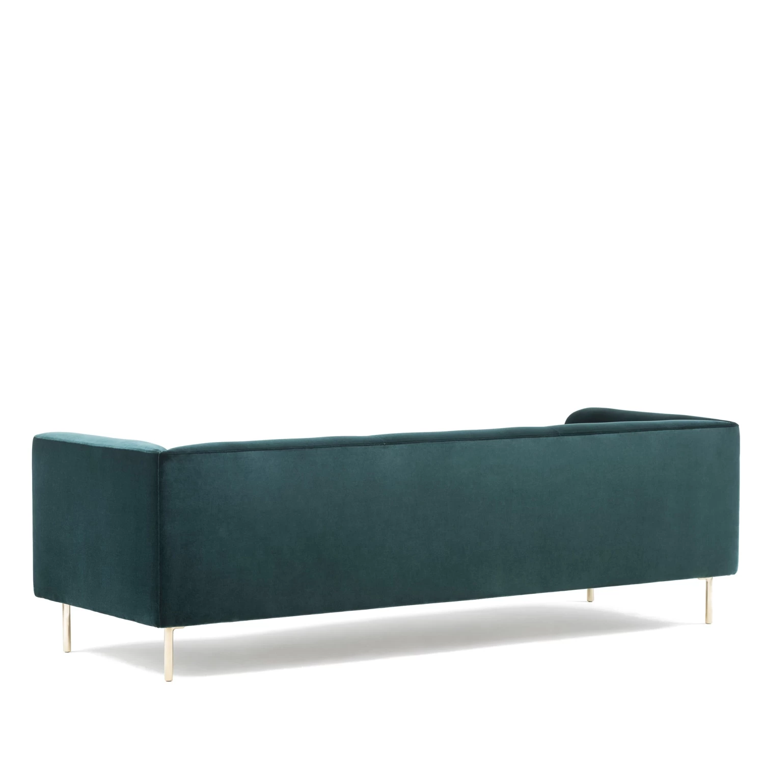 Gates Sofa has a modern form with elements of a more traditional American design aesthetic. An upholstered body with unique tufting on the backrest is raised upon slender bronze or brushed brass legs.