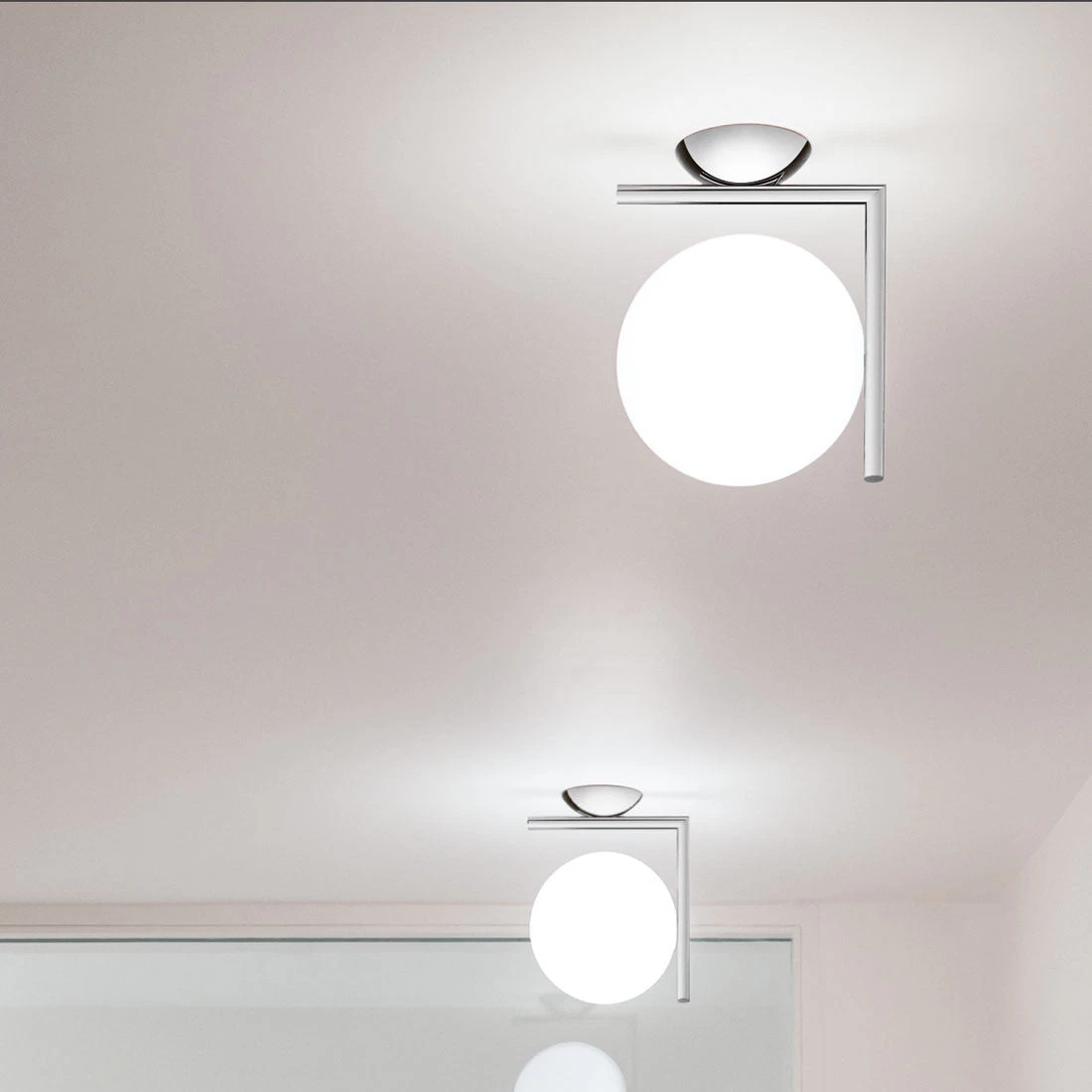 The IC light collection from Flos explores balance. The range includes table lights, wall lights, ceiling pendants and ceiling mounted lights which take as their basic form a sphere that is perfectly balanced on the edge of a rod. The light is diffused by smooth opal glass.