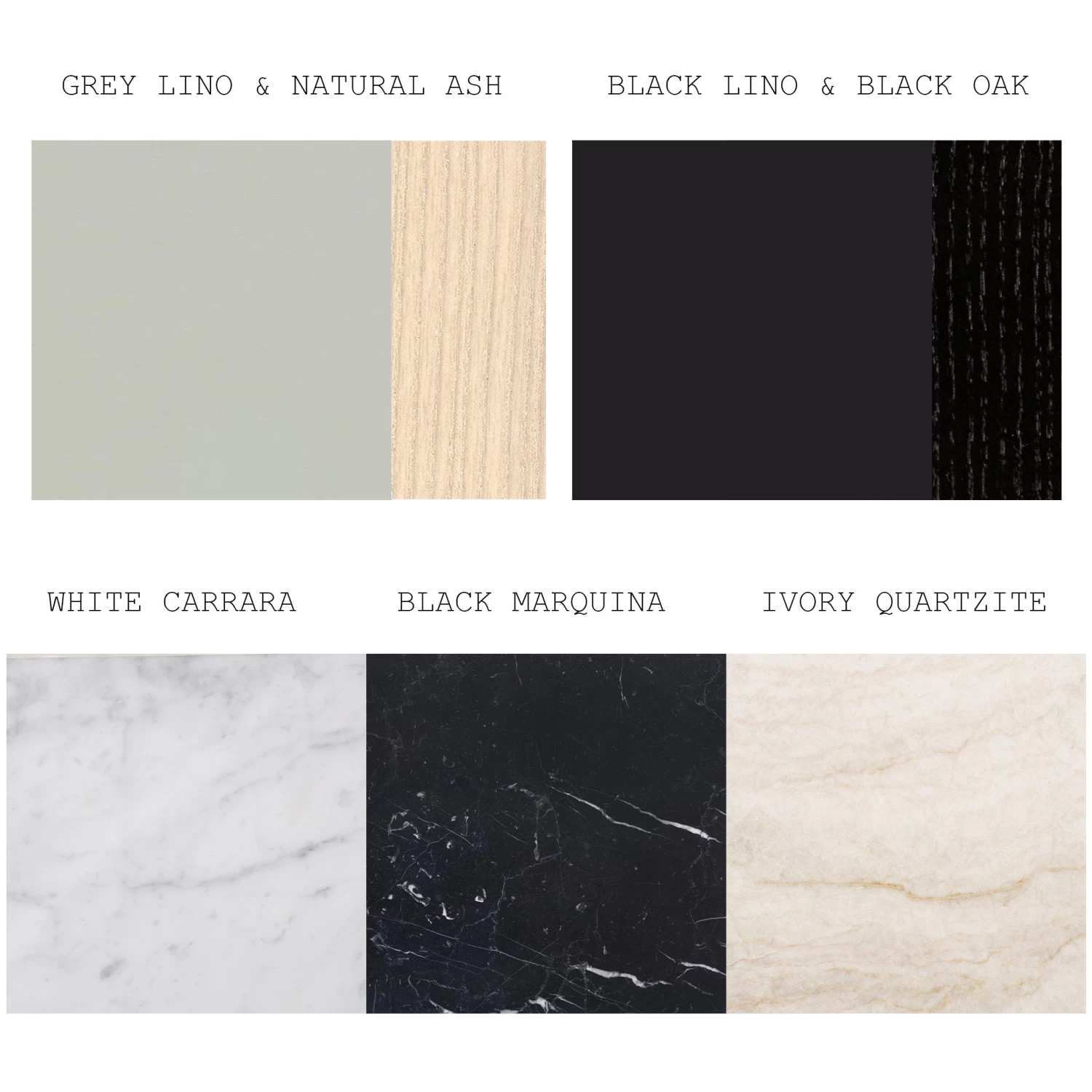 Black linoleum with black coloured through wood edge. Grey linoleum with light oiled wood edge. Glides included as standard.