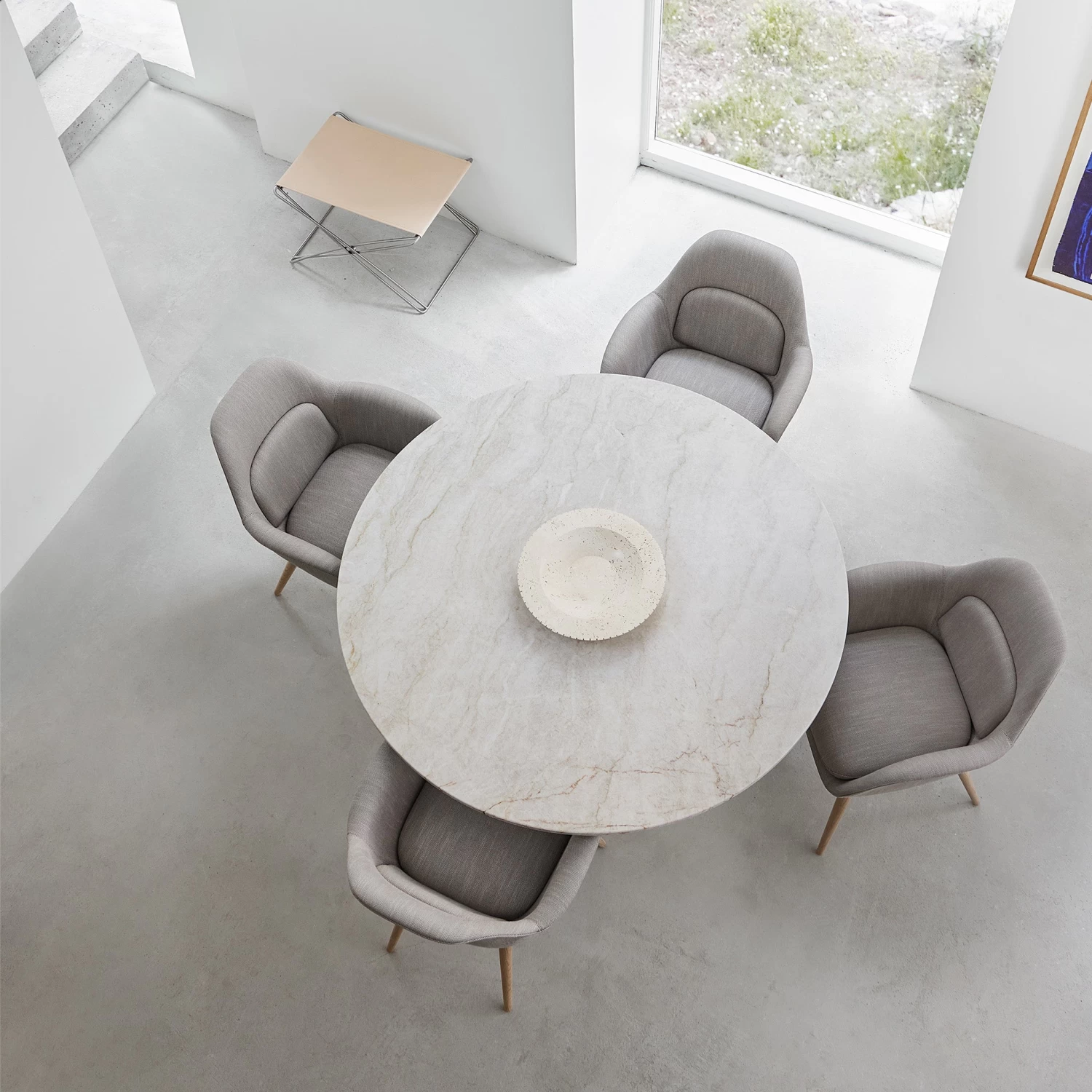 The sleek steel base supports a round tabletop in solid marble, quartzite stone or linoleum.