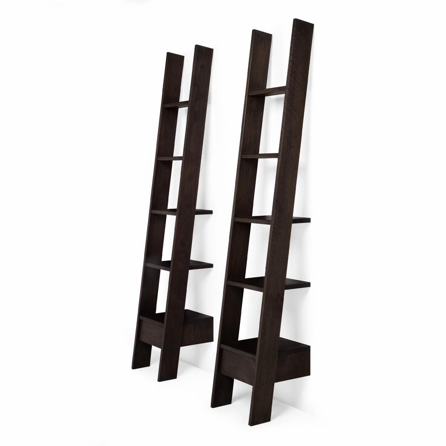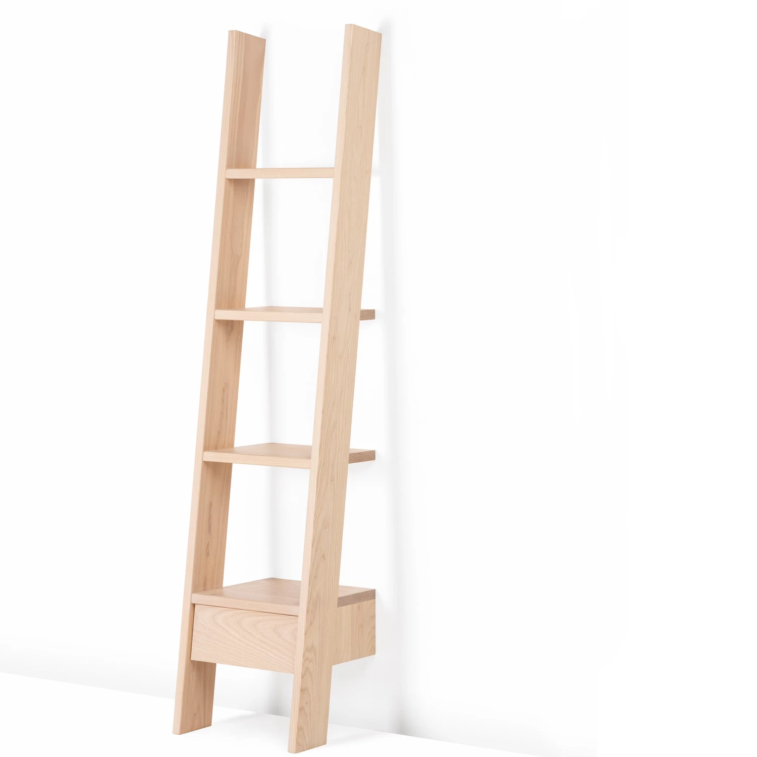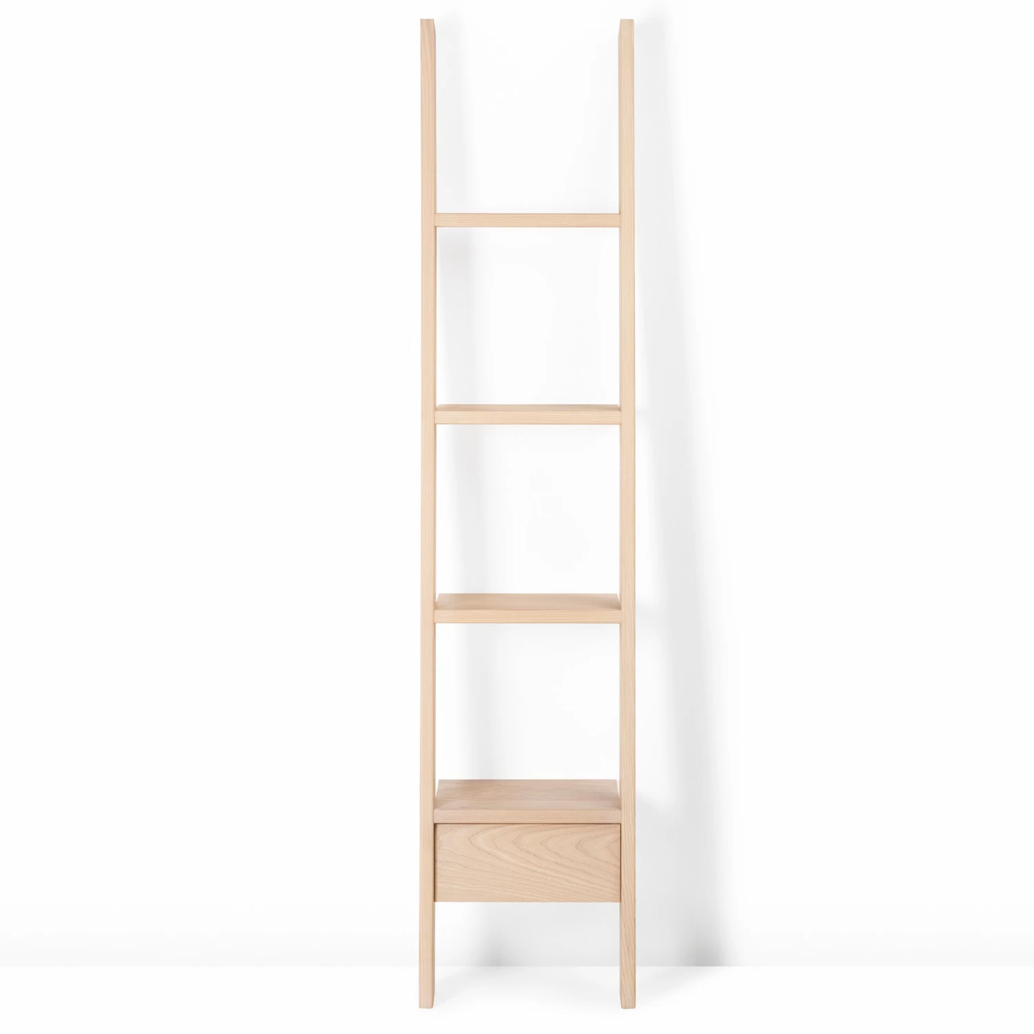 Ladder Bookcase offers generous storage with a relatively small footprint. Steps of varied depth meet the wall when placed at an angle. Shelves provide open display storage while a drawer on the lowest rung allows items to be tucked away. This statement piece is highly functional, and suitable for a variety of environments.