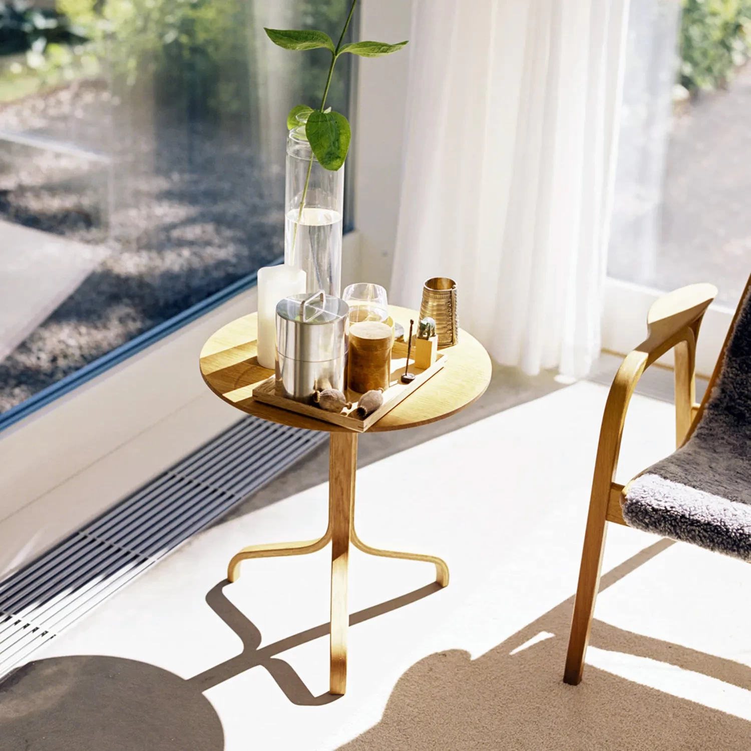 An elegant and organic side table which illustrates the endless potential of laminated wood. Available in various natural timber veneers.Â