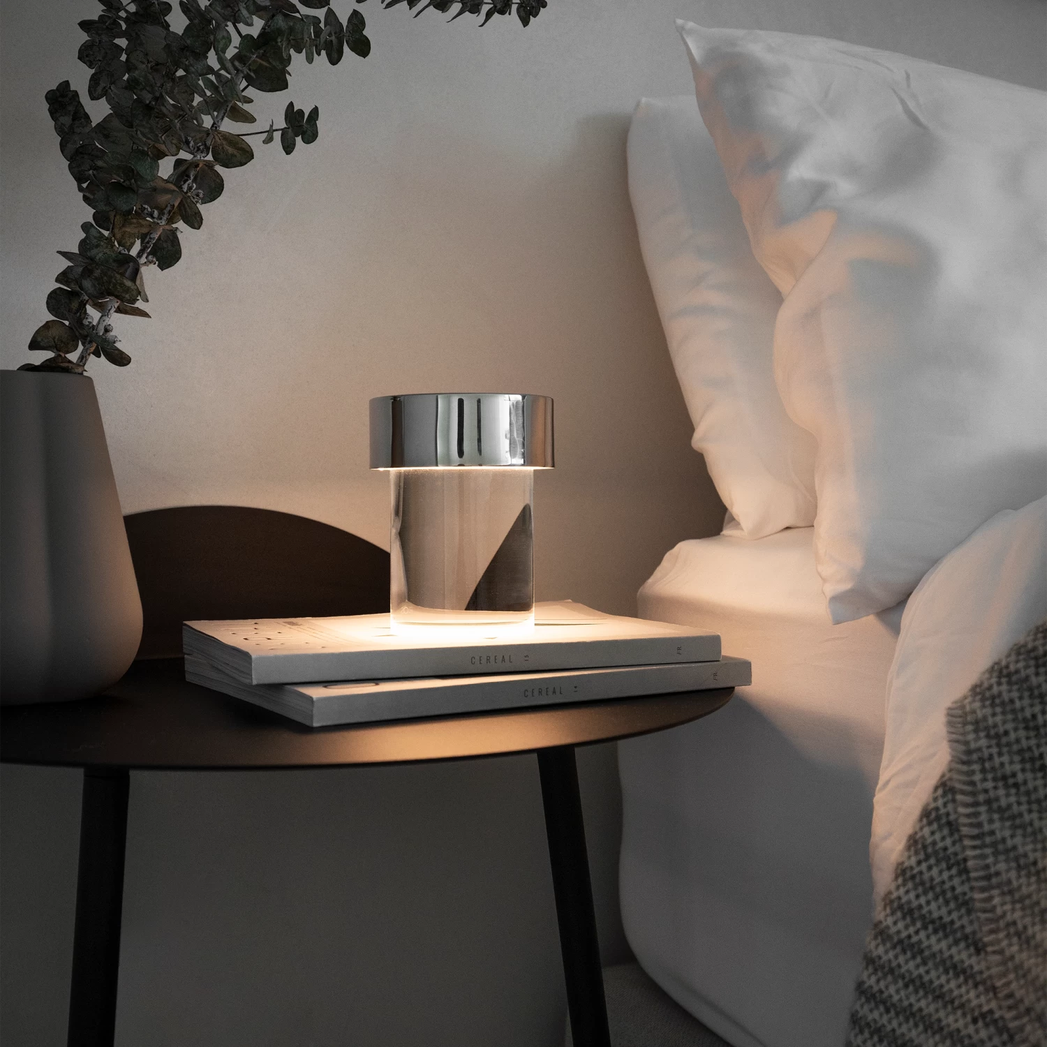 Last Order Clear is a rechargeable table lamp that diffuses light through a transparent solid glass base. The shape makes reference to the architectural typology of ancient columns.Â