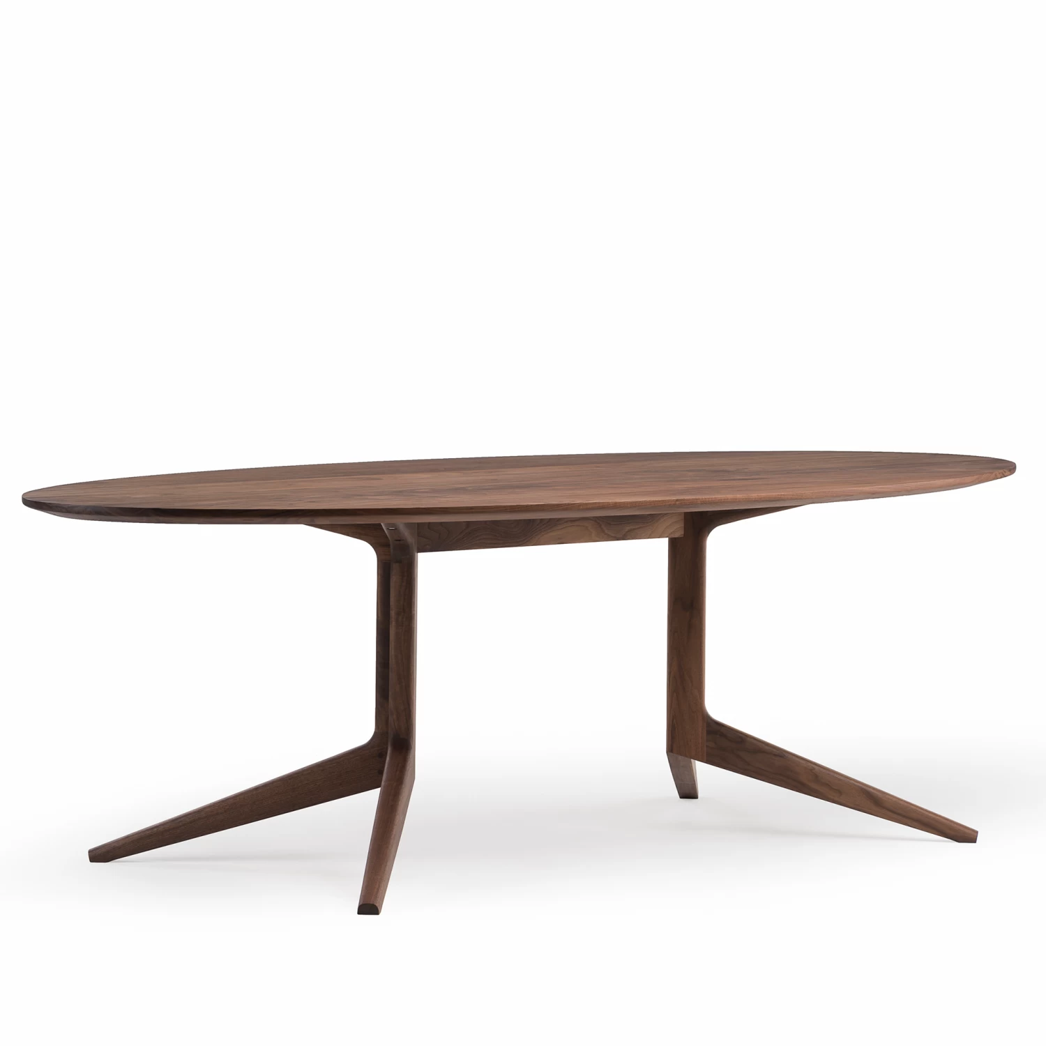 Light Oval Table reflects Matthew Hilton’s interest in the concept of ‘impossible lightness,’ where he tries to create the feeling of greater spaciousness in a room by reducing the visual weight of his furniture. Surprisingly slender, this sculptural table features a slim tabletop, with timber planks oriented lengthwise to proudly display the quality and natural beauty of the material, and a cantilevered leg with complex joinery.
