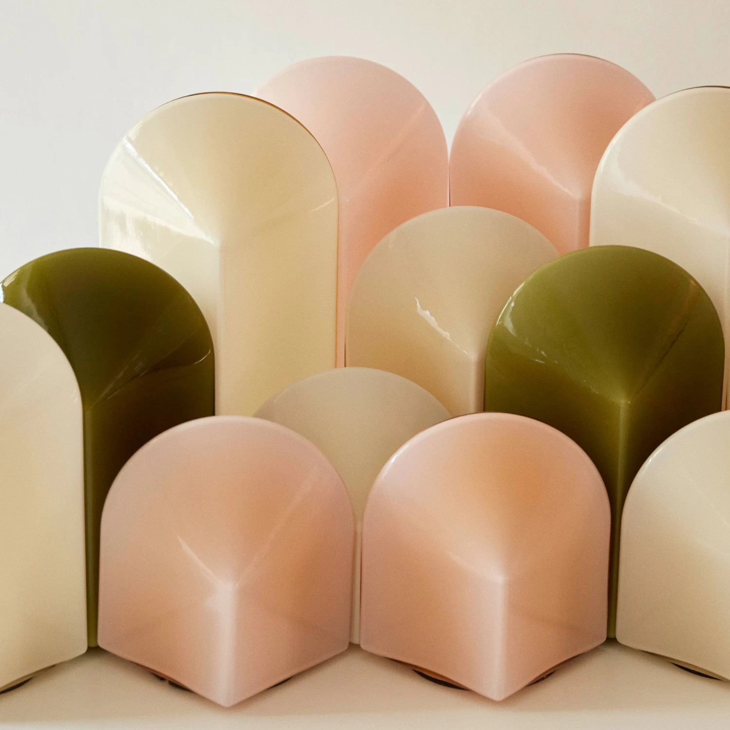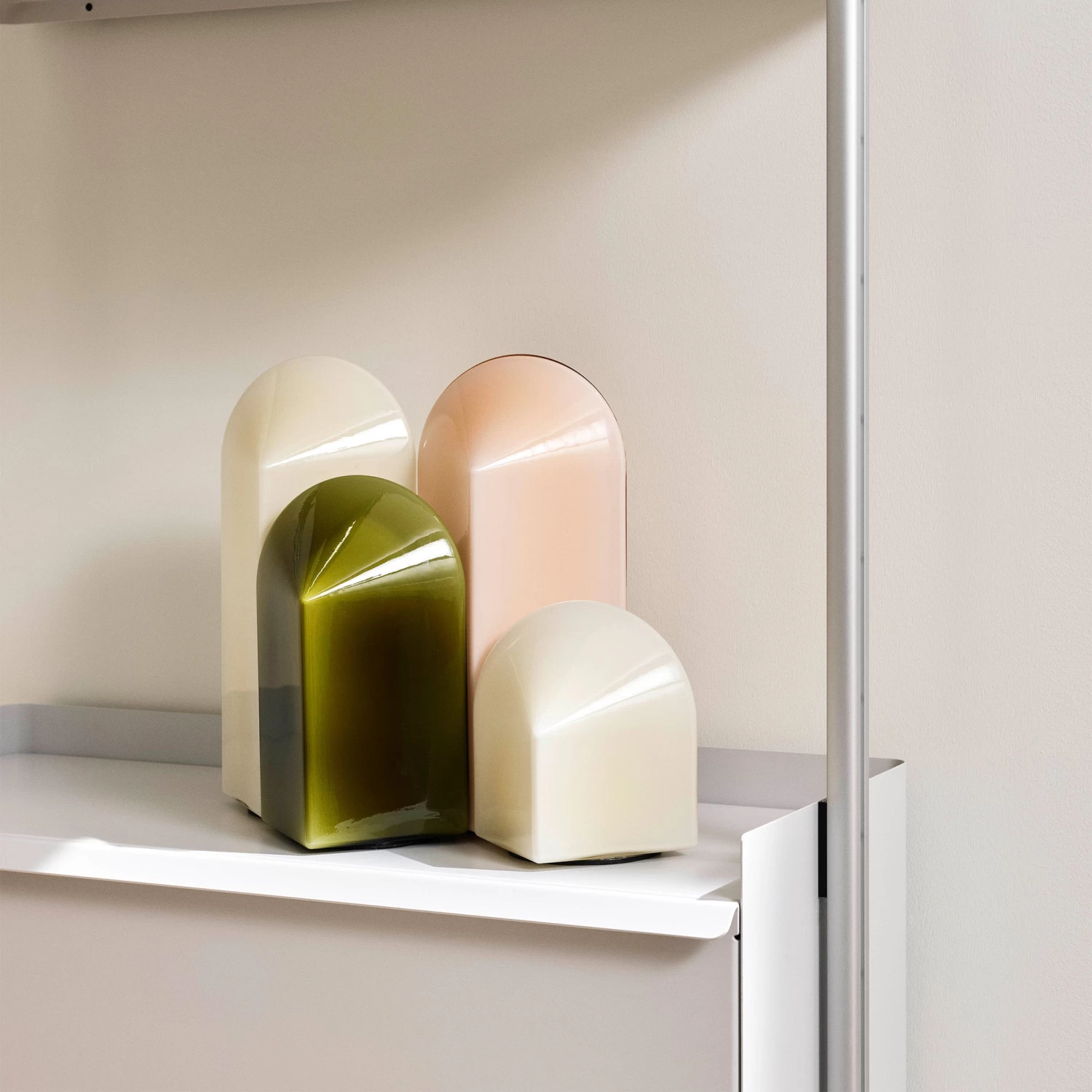 The glass geometric shape is made in carefully selected sizes and colours, designed to complement each other in height, tone and temperature and thereby creating a cohesive effect.