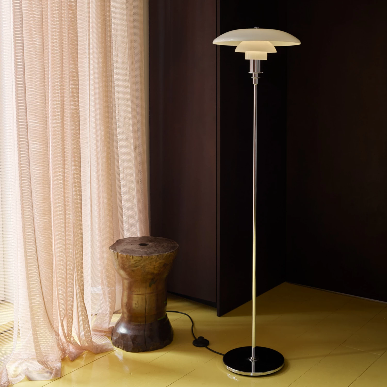 Designed based on the principle of a reflective three-shade system, which directs the majority of the light downwards. The shades are made of hand-blown opal three-layer glass, which is glossy on top and sandblasted matte on the underside, giving a soft and uniform light distribution.