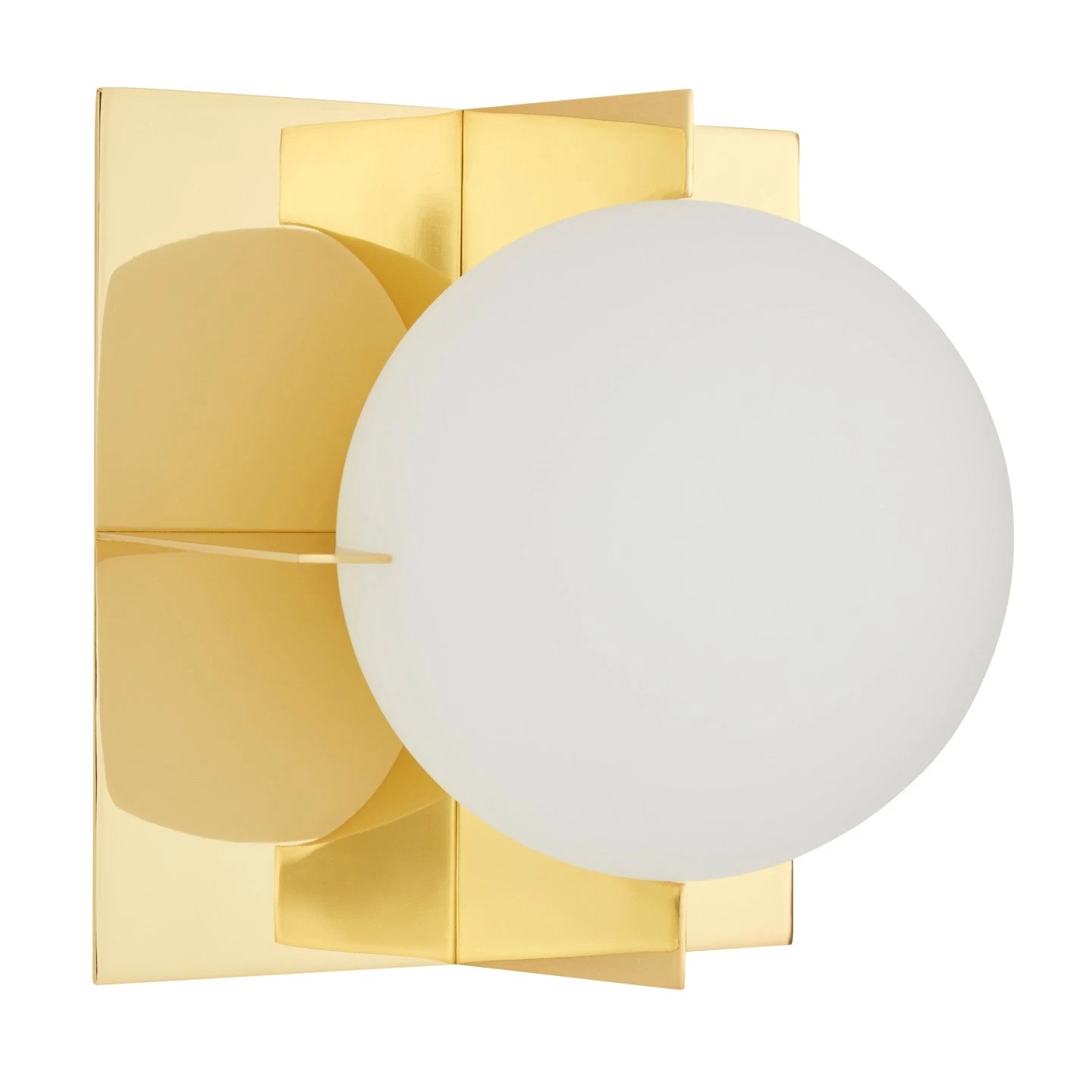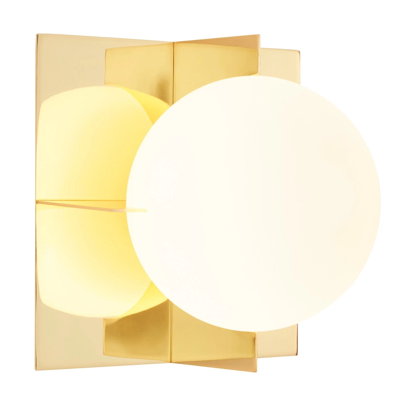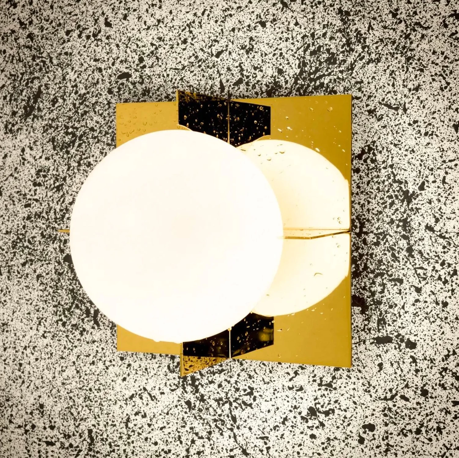 Minimalist yet expressive, the Plane wall lamp is constructed from two interlocked square brass-plated steel frames that enclose a double-layered white glass sphere. Plane wall emits a soft ambient light and can be used in multiple configurations either on the wall or on the ceiling.