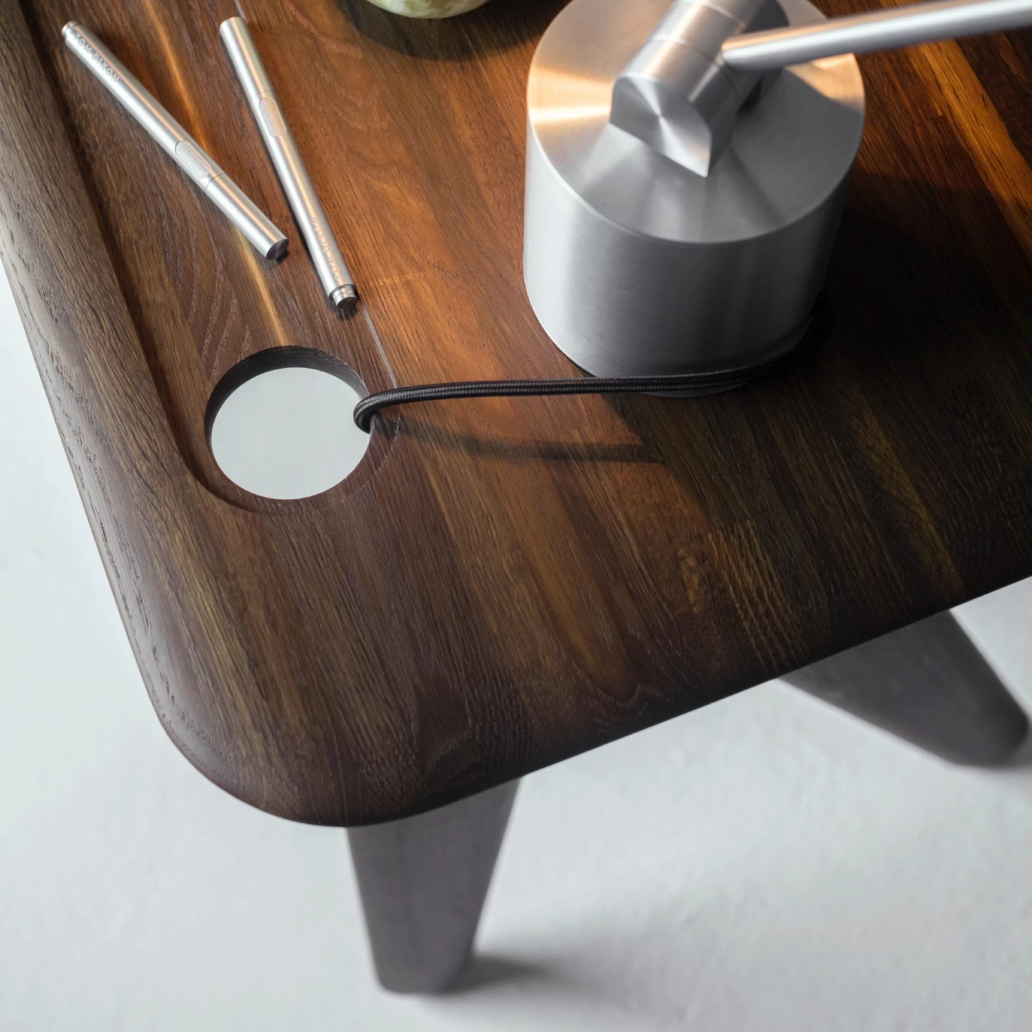 Made from solid oak construction, with softly rounded edges and understated proportions, the traditional inkwell is transformed into a cable management hole, and a deeply machined groove has room for pens and accessories.