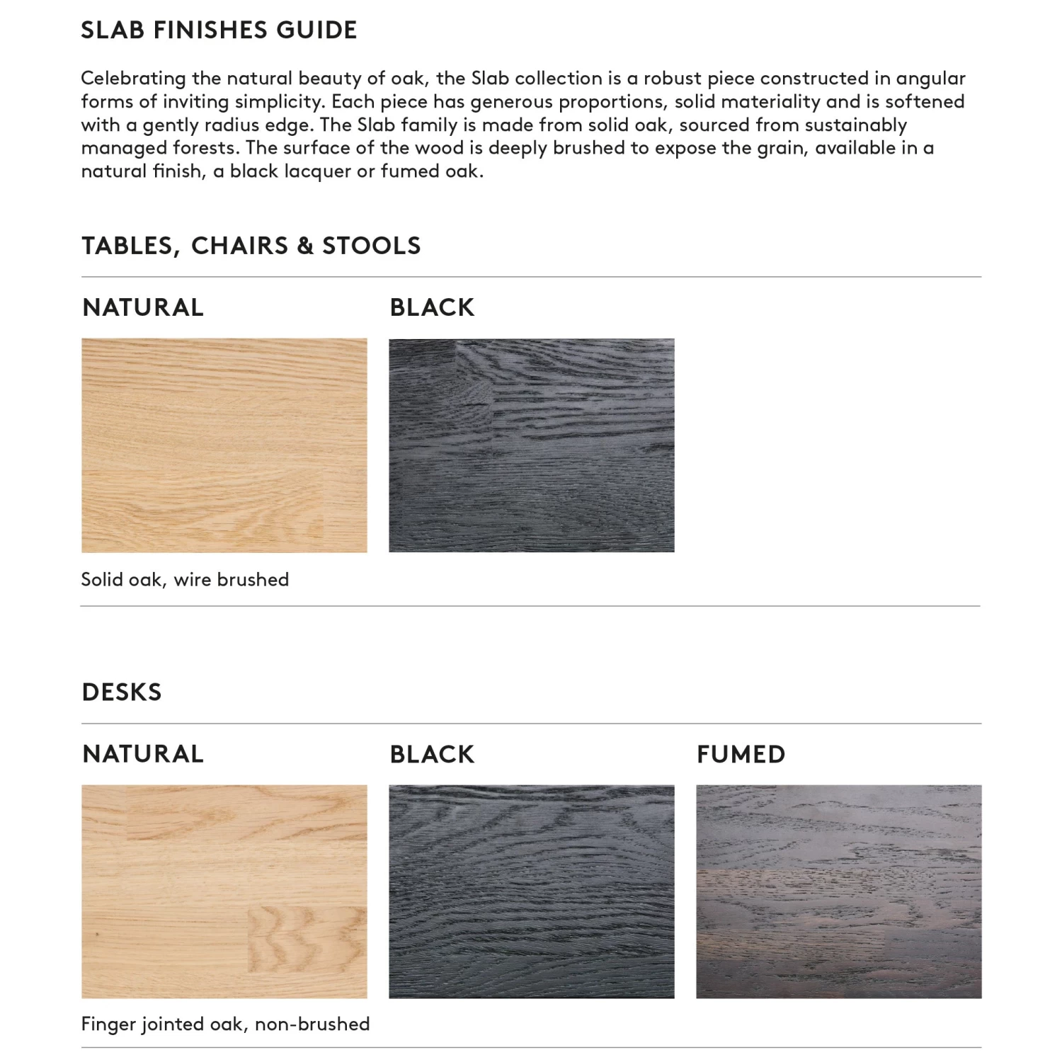Solid oak with a brushed, matt lacquered finish. Oak sourced from sustainably managed forests.