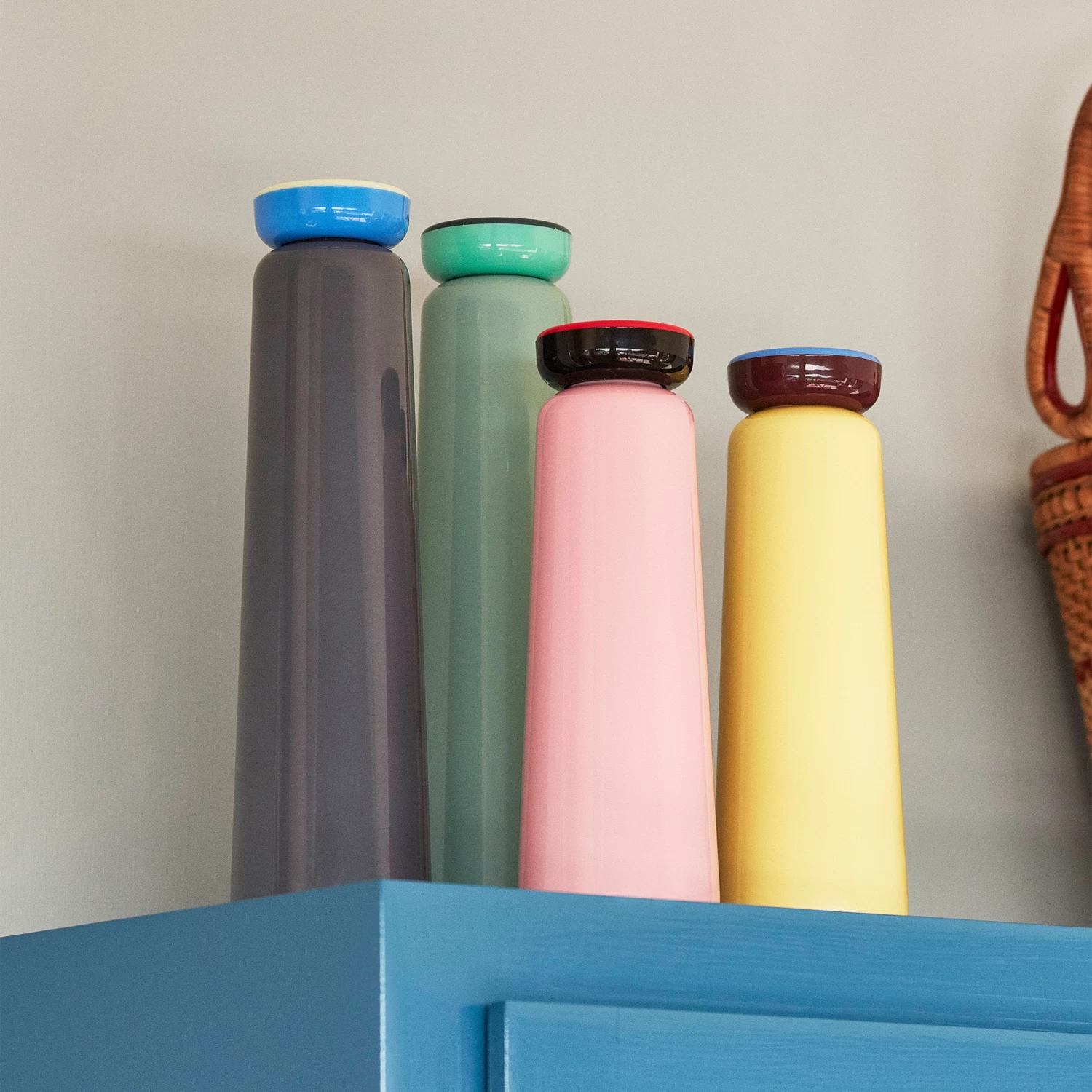 Contrasting colours make for a playful expression with this bottle series. Crafted in stainless steel with a plastic screw lid, the functional design is suitable for containing hot and cold drinks. Available in different sizes and colours.
