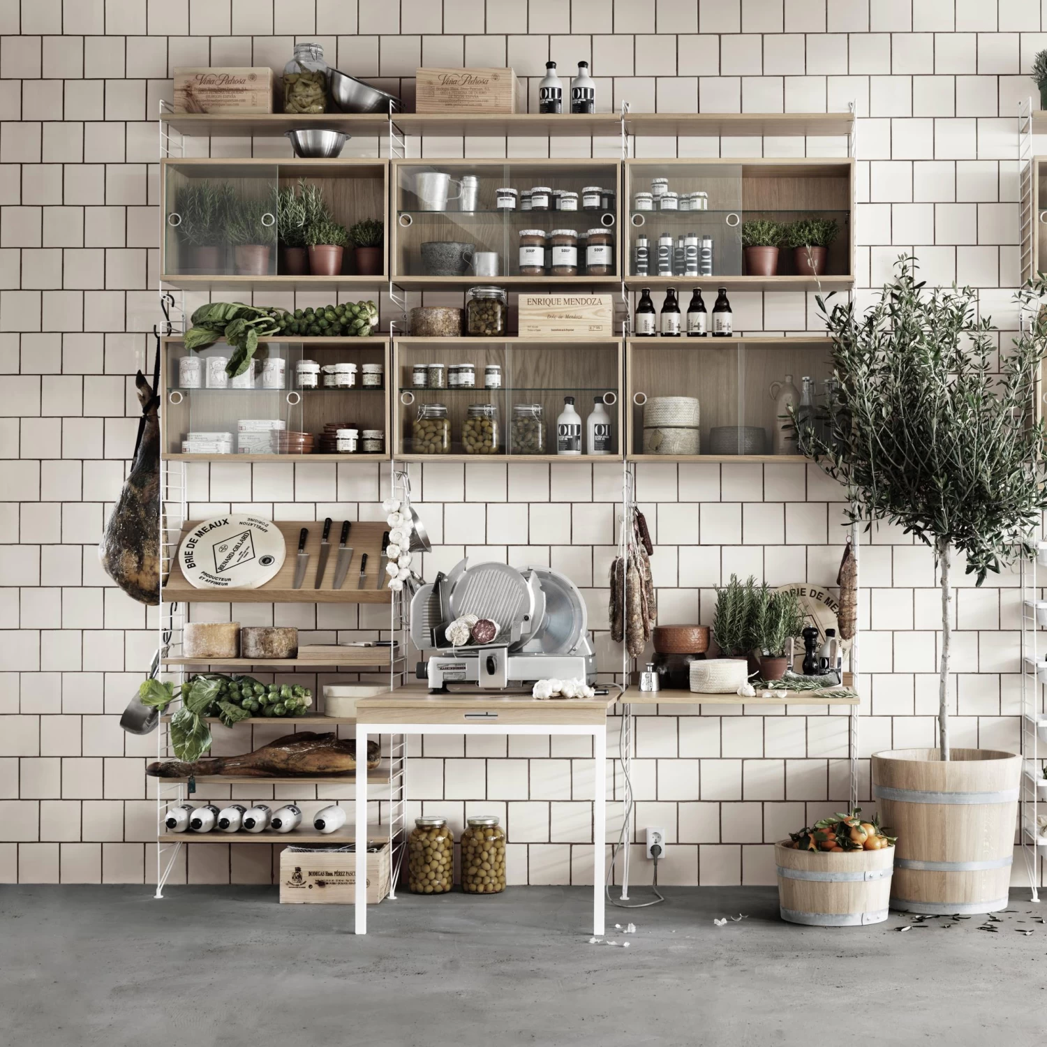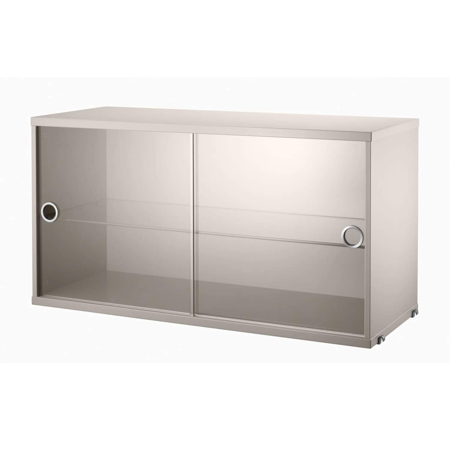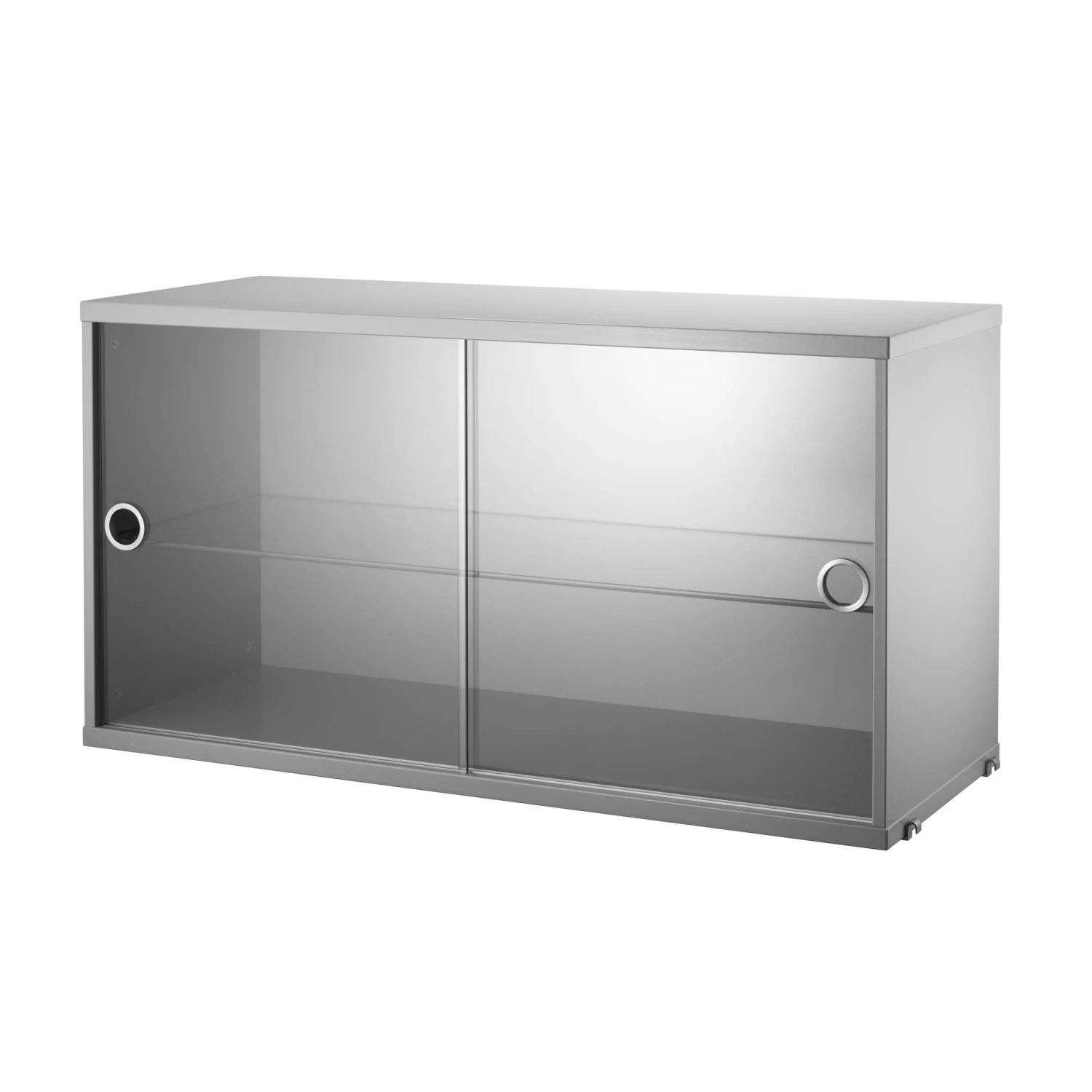 The Display Cabinet has two sliding clear glass doors with chrome pull handles, which run in tracks. Includes internal glass shelf. Flat packed, can be integrated into String® Shelving system in just a few simple steps.