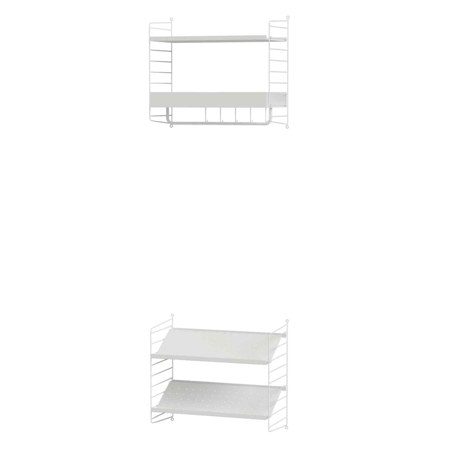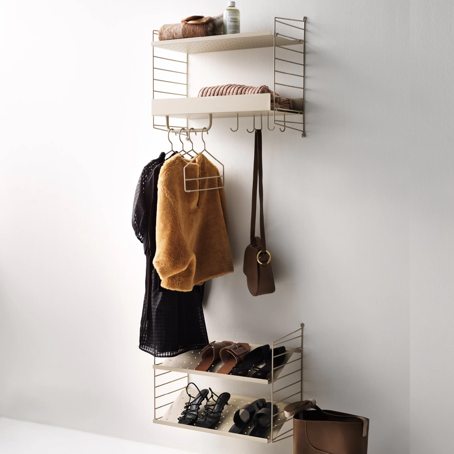 This String Hallway Bundle E is small hallway solution with both wall hanging and floor standing options to cater for all your hallway storage needs. Split your hallway combination in two, with hooks and rods for your outerwear and perforated shoe shelves on the wall hung panels. This combination will keep your hallway tidy while looking stylish.