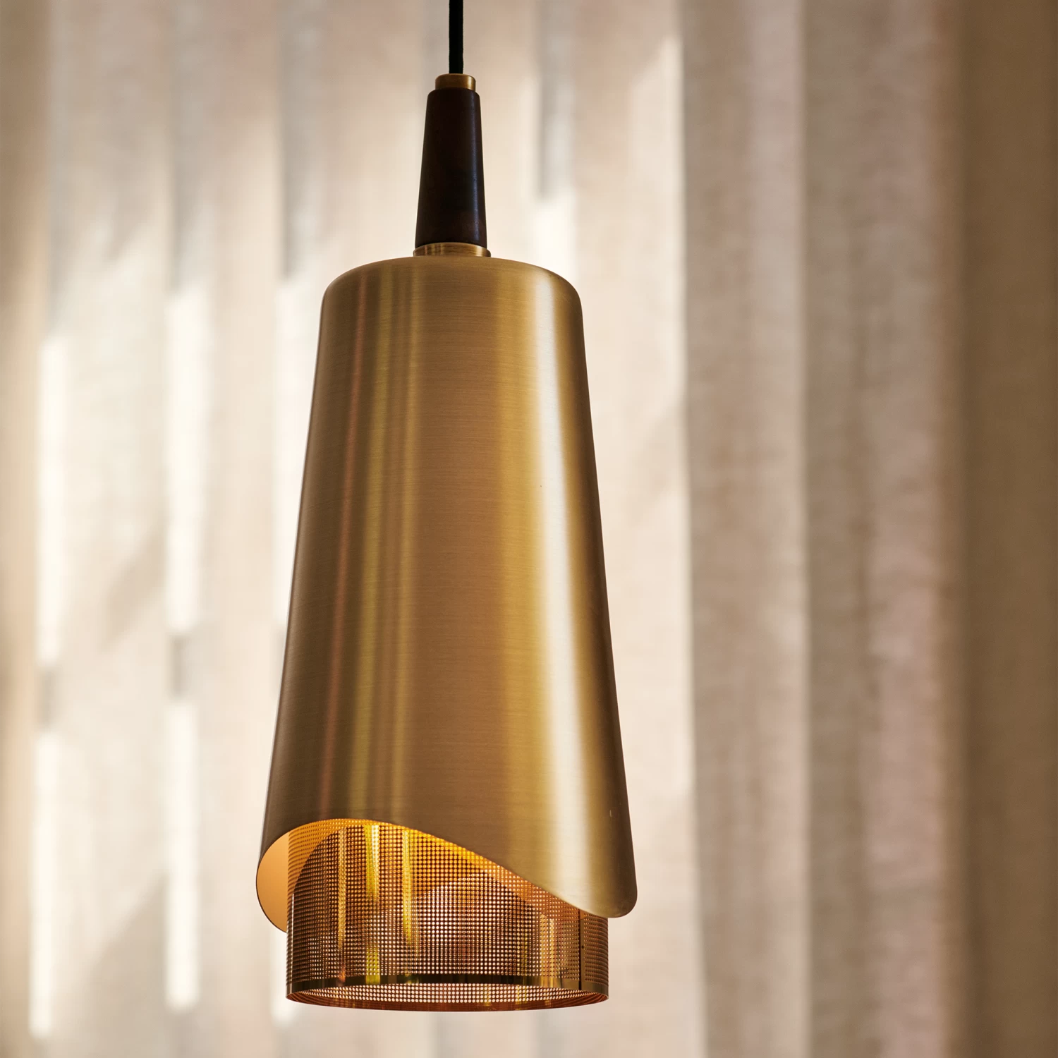 Spun brass shade with plated mesh, milled brass knob, and hand cut wood.