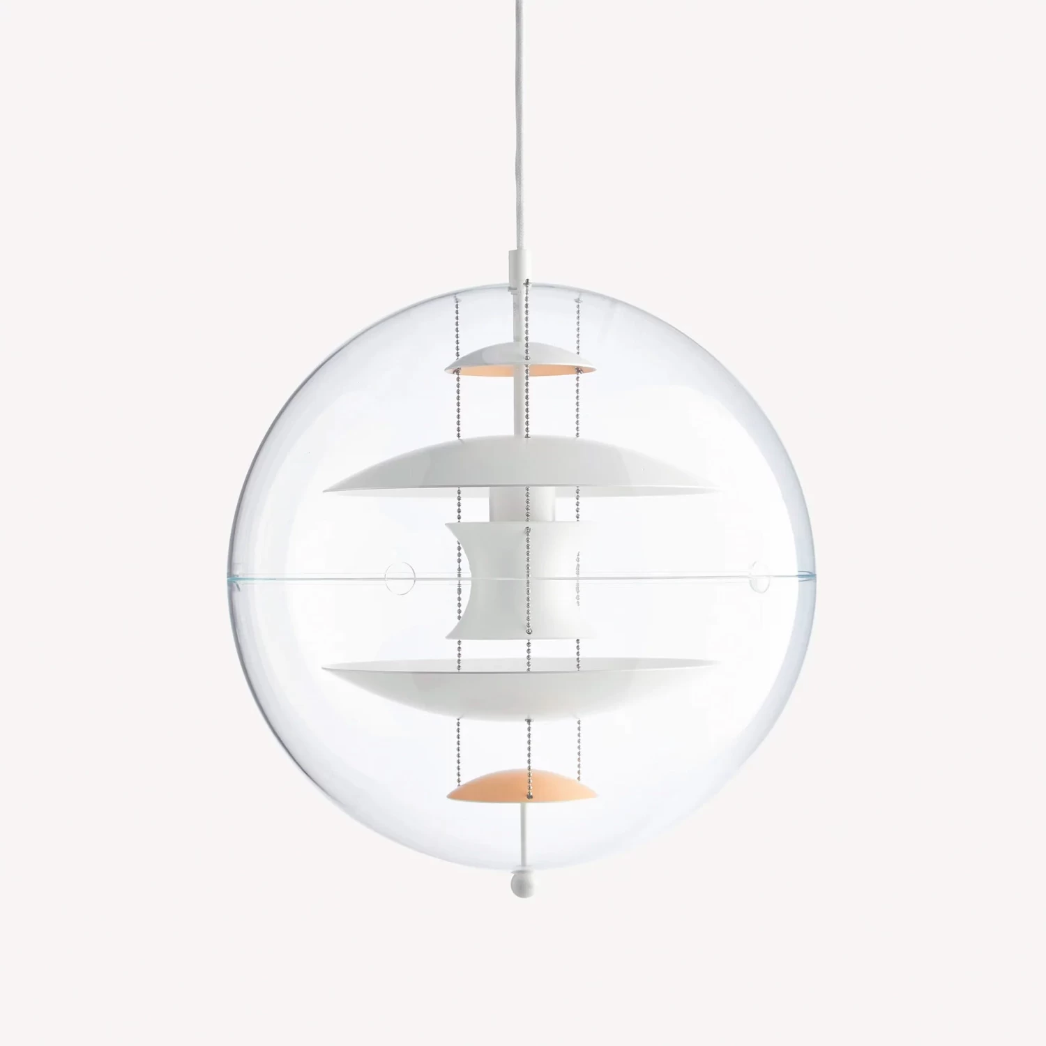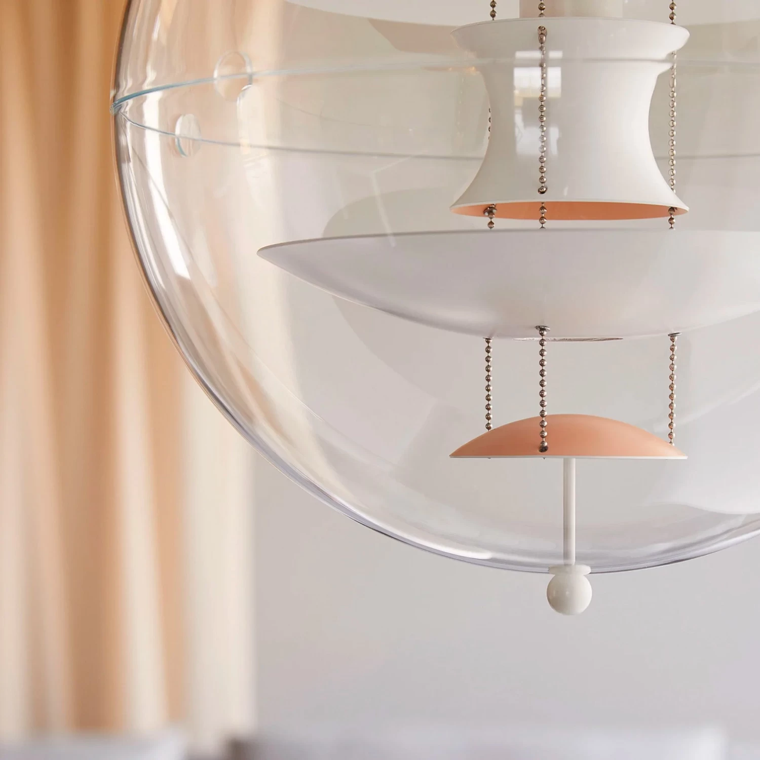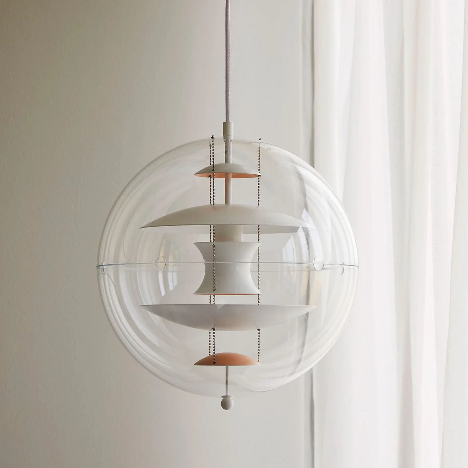 Conceived in 1969 by Verner Panton, the VP Globe is arguably the most recognized Panton lighting design. The decorative pendant features a crystal clear transparent acrylic outer-shell with five internal reflector shades suspended by delicate steel chains.