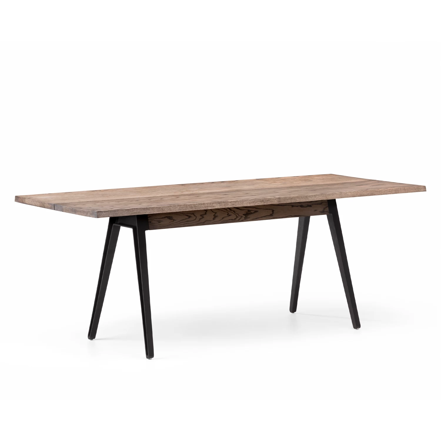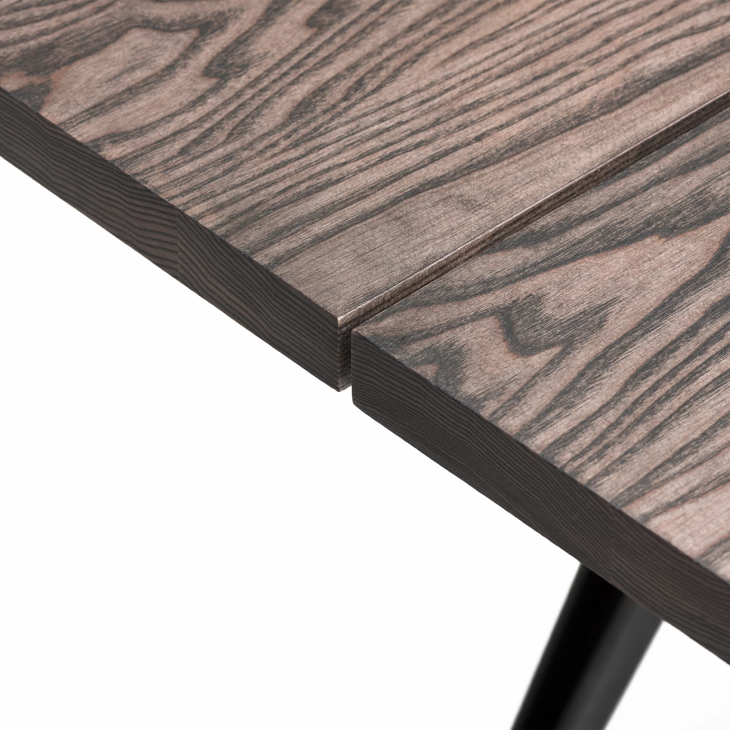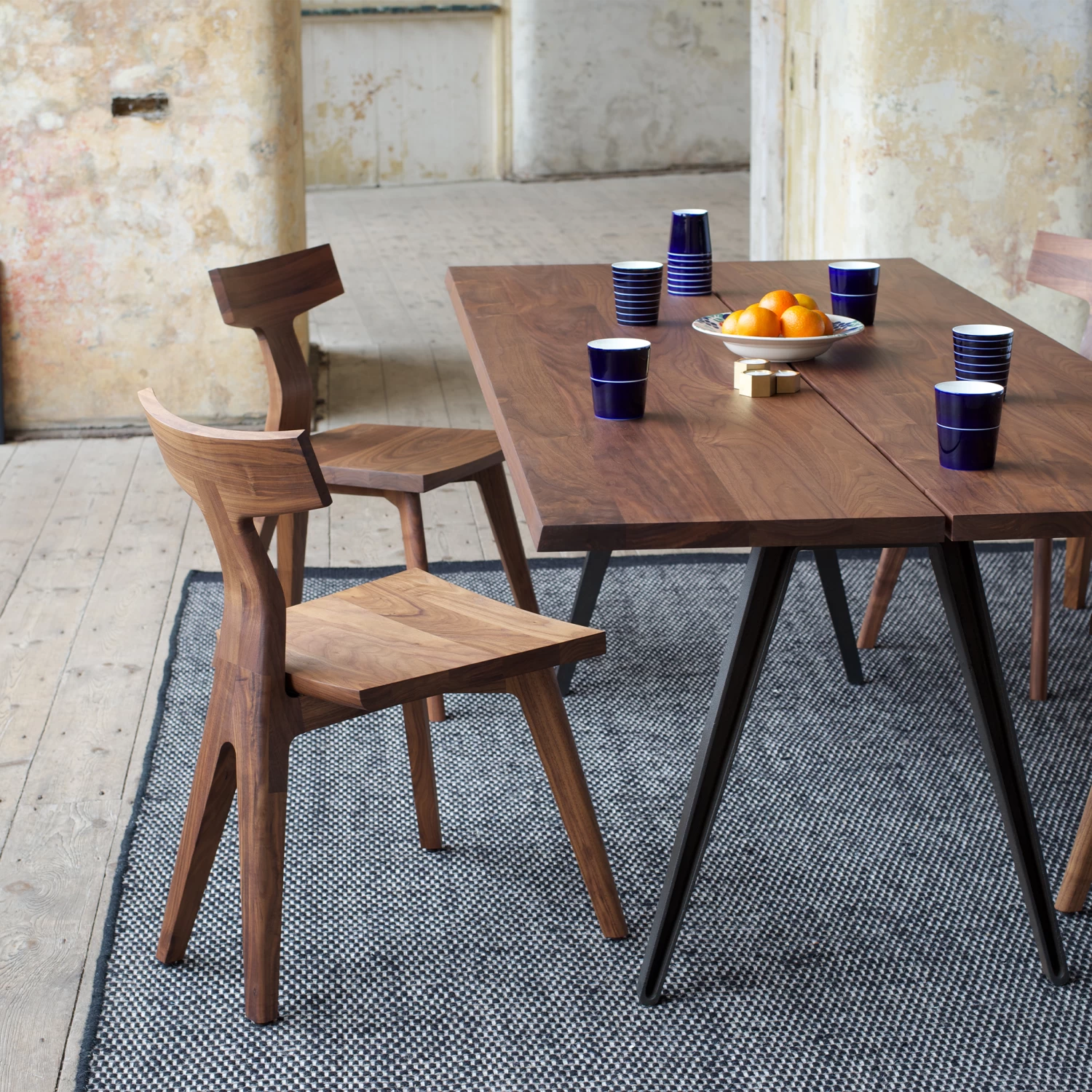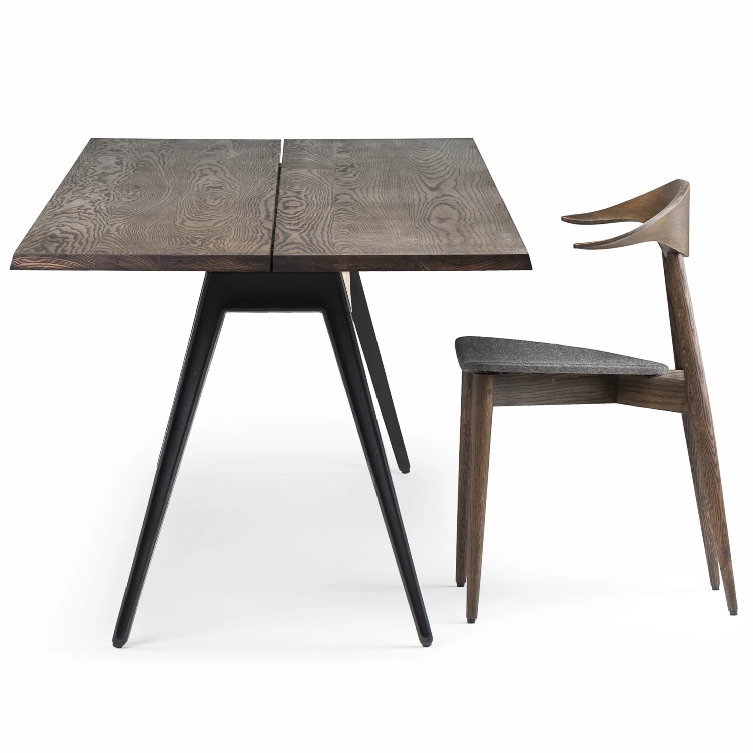 Welles Table makes generous use of solid wood with an elegantly simple form. The tabletop, detailed with a central divide and angled edges, is set upon cast iron legs. This table is quietly functional while remaining approachable and appealing to the senses.